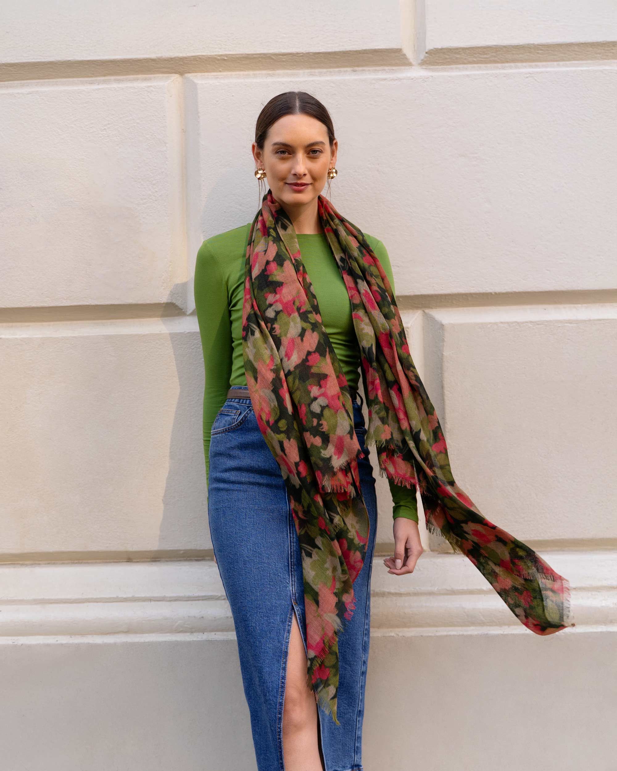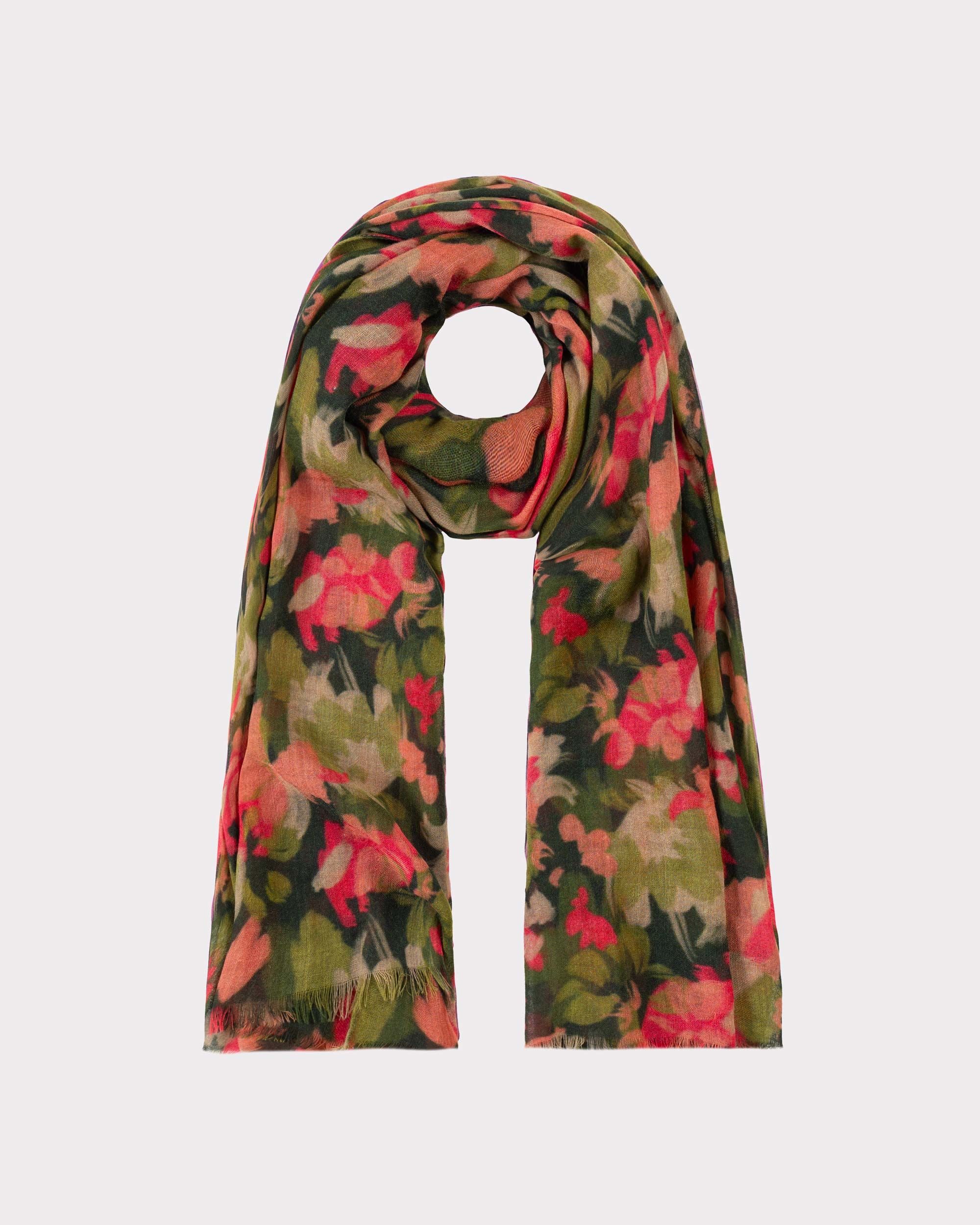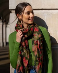 A soft wool scarf in our brushed floral print in two colourways. This piece features the same pattern as our brushed floral dress and skirt in deeper tones to complement the natural texture of wool. Cut in a rectangular shape, it is finished with two gently frayed edges and two neat sewn hems.