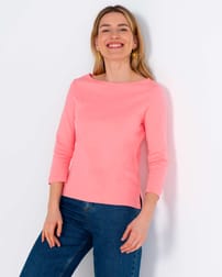 A timeless wardrobe staple designed for effortless everyday style, this cotton top combines a flattering shape with a beautifully structured feel. The classic boat neckline and ¾ length sleeves create an elegant, versatile silhouette, while the relaxed regular fit ensures easy comfort. The fabric holds its shape, giving a polished finish that’s still easy to wear. Side vents at the hem add subtle movement, making this a piece you’ll reach for season after season.