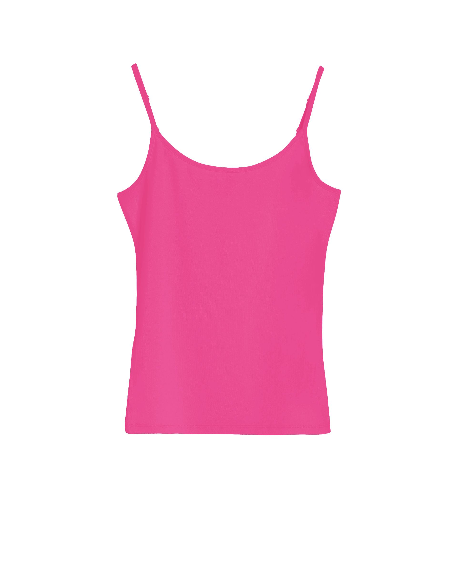 This fitted camisole features a flattering curved neckline, adjustable spaghetti straps, and a curved back for a modern, feminine shape. Made from viscose elastane jersey, it offers a comfortable stretch and can be worn as a single layer without being see-through. Perfect for layering, it pairs beautifully with skirts, jeans, or trousers, and adds a cheerful pop of colour under knits or jackets.