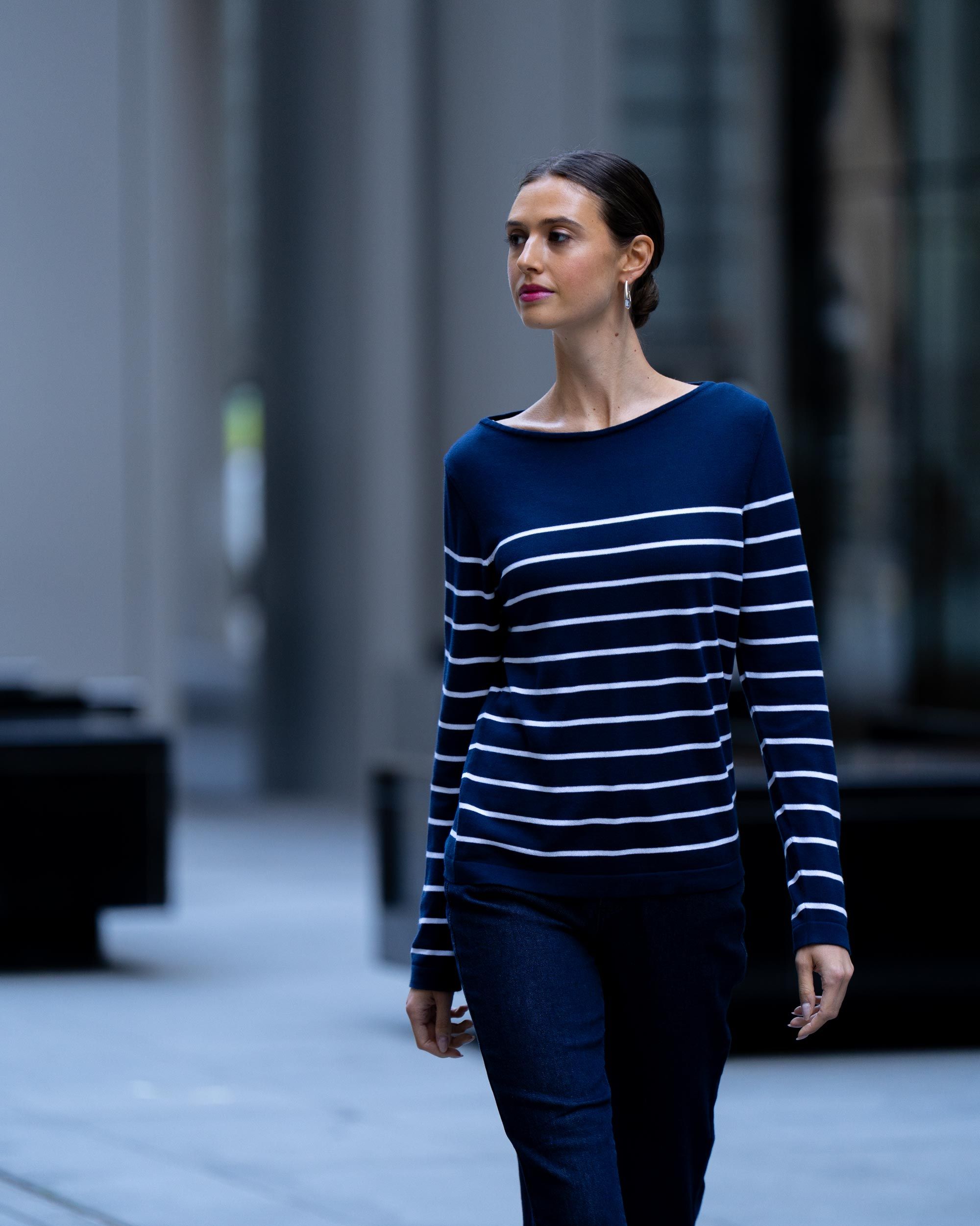 This knit sweater is designed with a flattering wide neckline and classic long sleeves. It offers a relaxed yet refined silhouette that suits everyday dressing. Crafted from 100% organic cotton, the subtle stripes bring a fresh, nautical-inspired charm, ideal for weekend wear when you want both comfort and confidence in your look. A lightweight knit with a regular fit makes it an easy go-to, whether you’re styling it solo or under your favourite jacket. Part of our Knitwear collection, it’s a wardrobe staple that balances sustainability with effortless elegance.