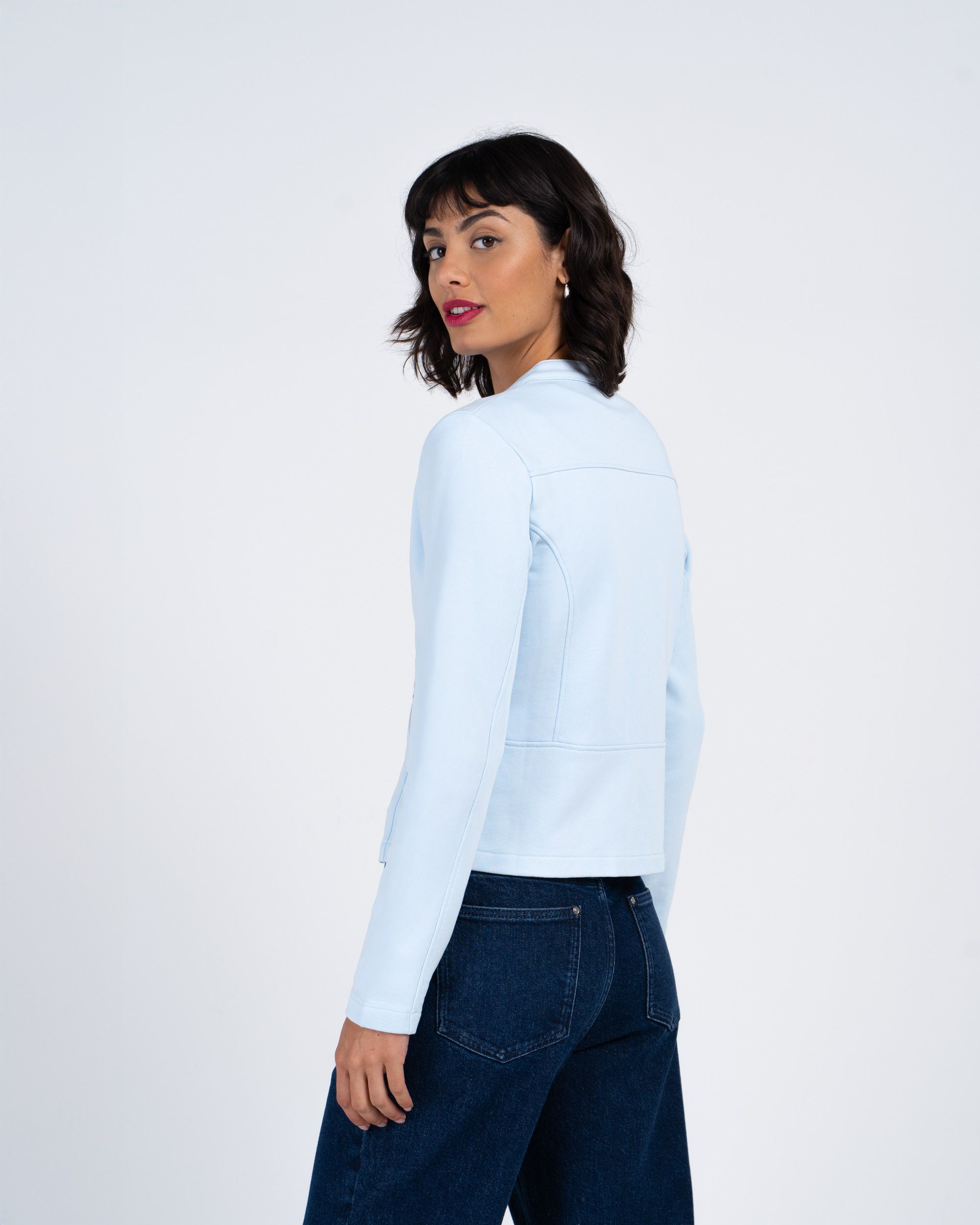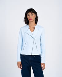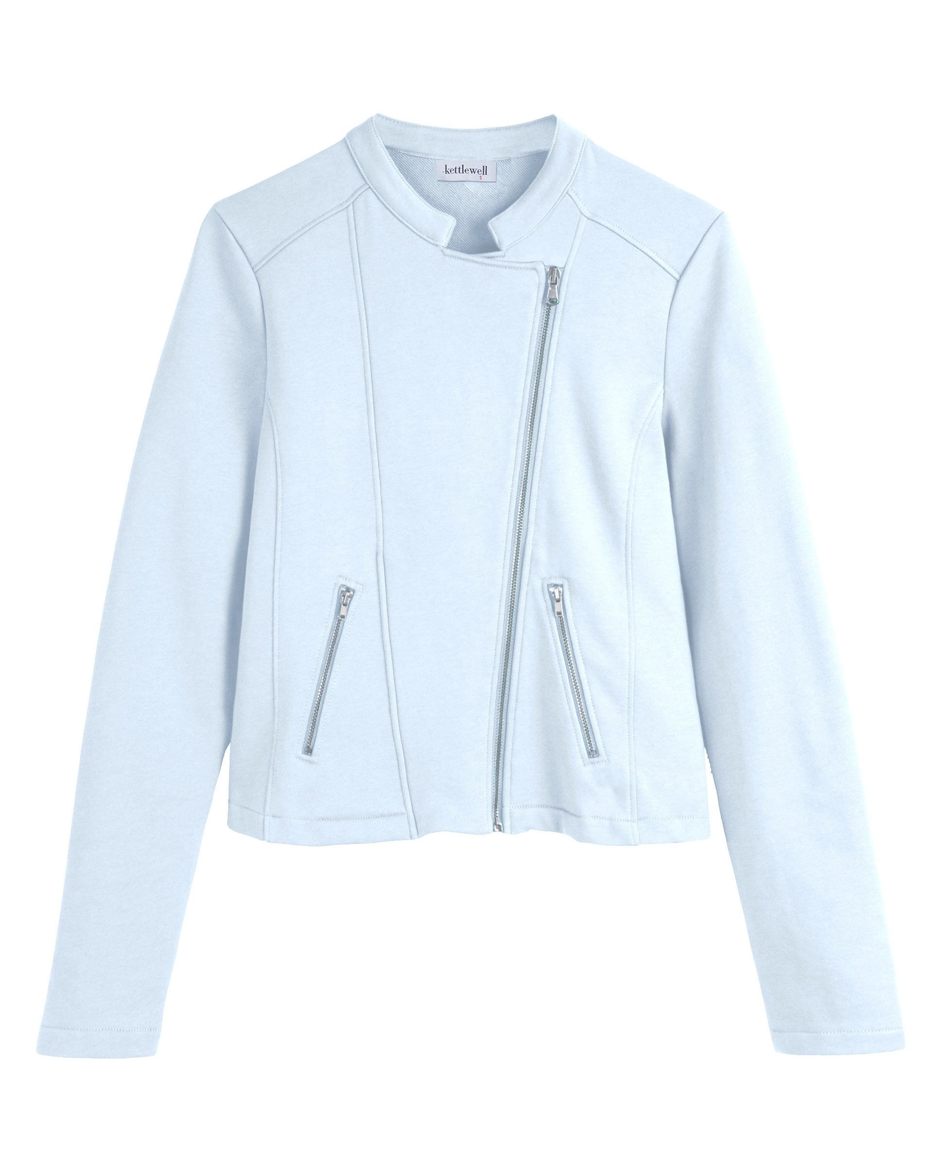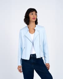 A neat but comfortable cropped biker style jacket in 100% stretch cotton. Features asymmetric full metal zip front fastening and zip pockets, and a short collar stand neckline. Unlined for everyday wear.