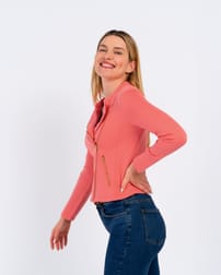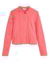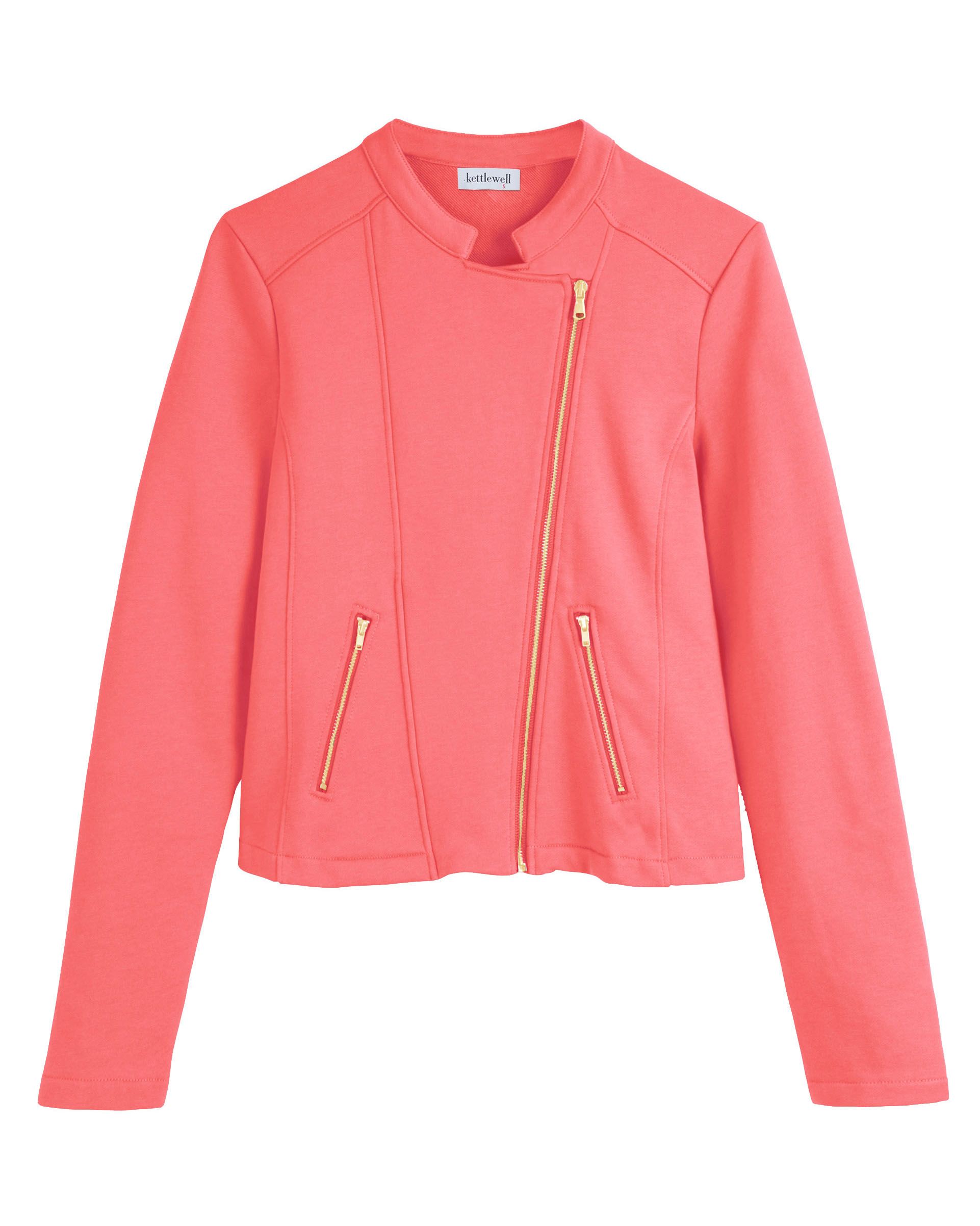 A neat but comfortable cropped biker style jacket in 100% stretch cotton. Features asymmetric full metal zip front fastening and zip pockets, and a short collar stand neckline. Unlined for everyday wear.