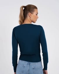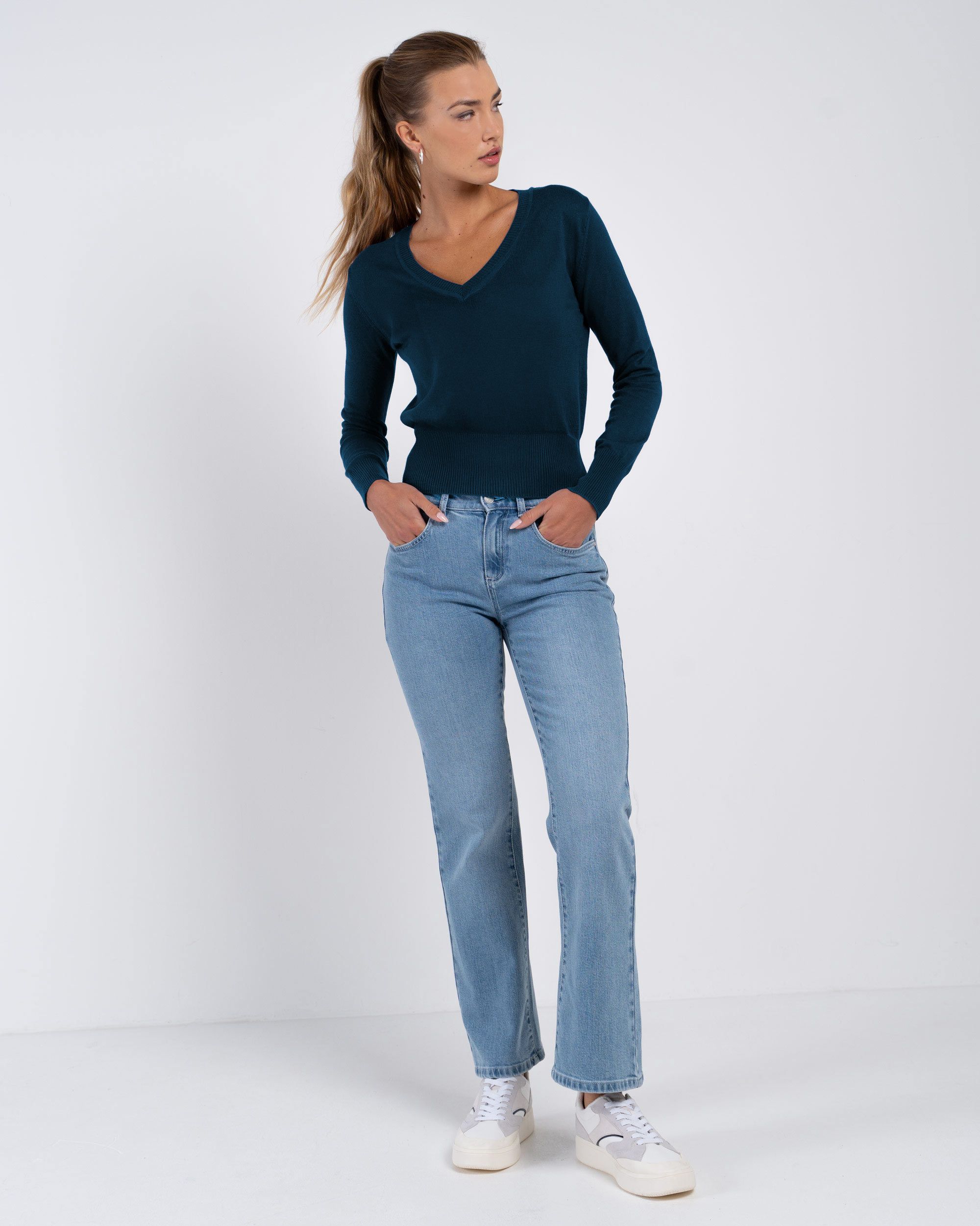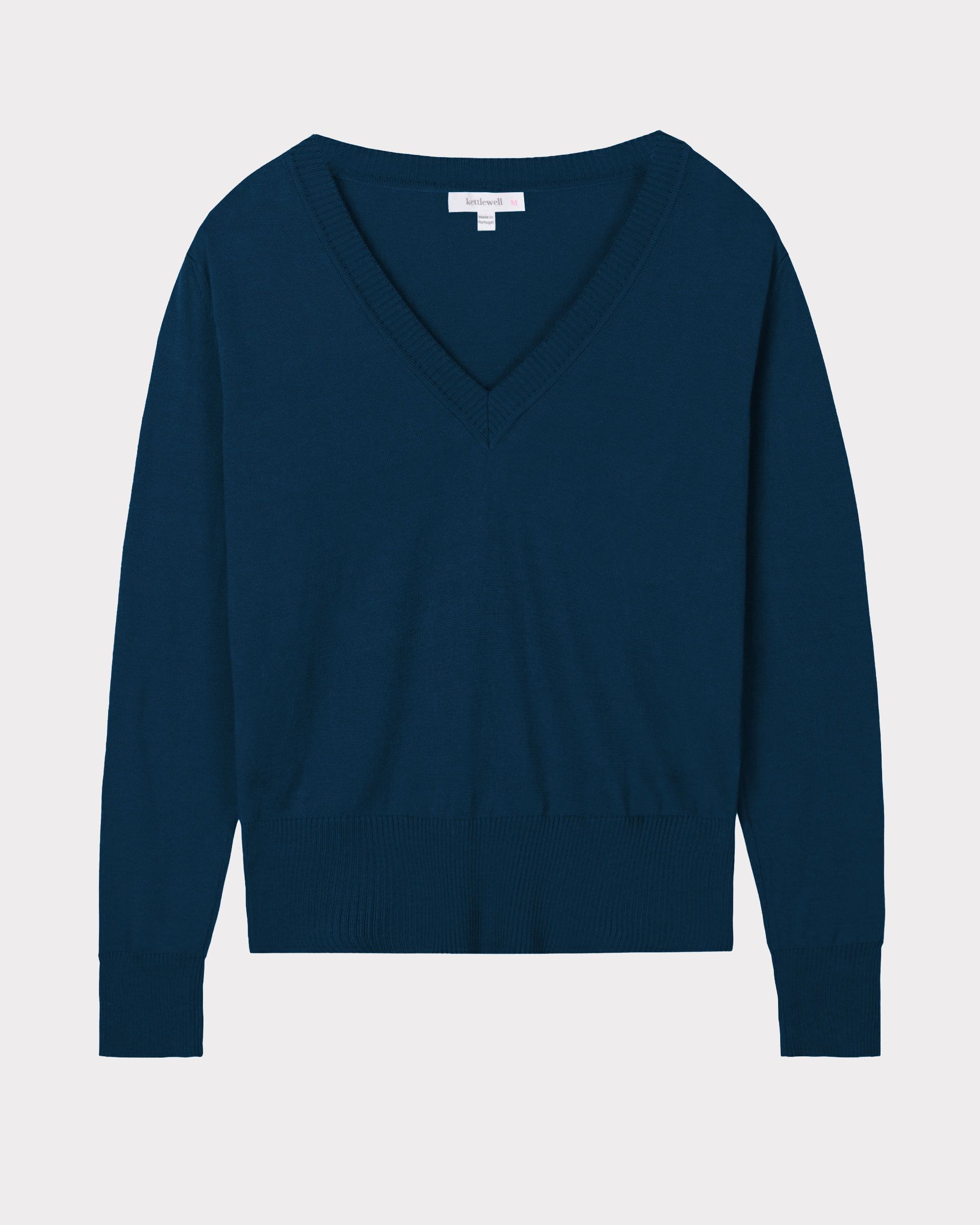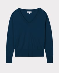 Bring a modern twist to your knitwear collection with this fitted V neck jumper, featuring long sleeves and neat ribbed trims. Crafted from 100% organic cotton, the lightweight fine knit is breathable, naturally soft, and gentle against your skin. It is ideal for layering and keeping warm during transitional weather. Fashioned seams at the edges offer lasting stability and a clean finish. Perfect for styling with skirts or jeans from work to weekend.