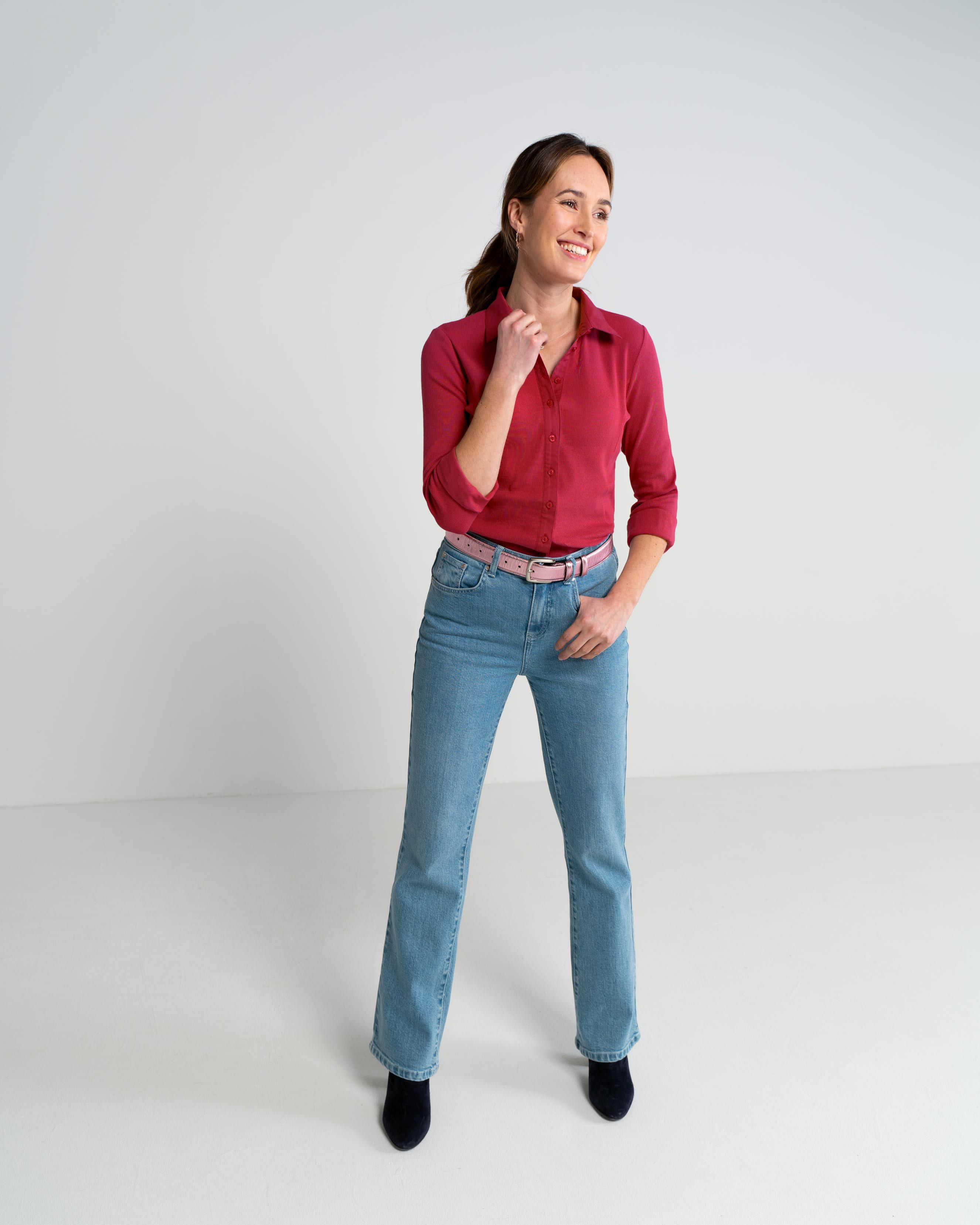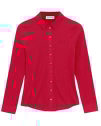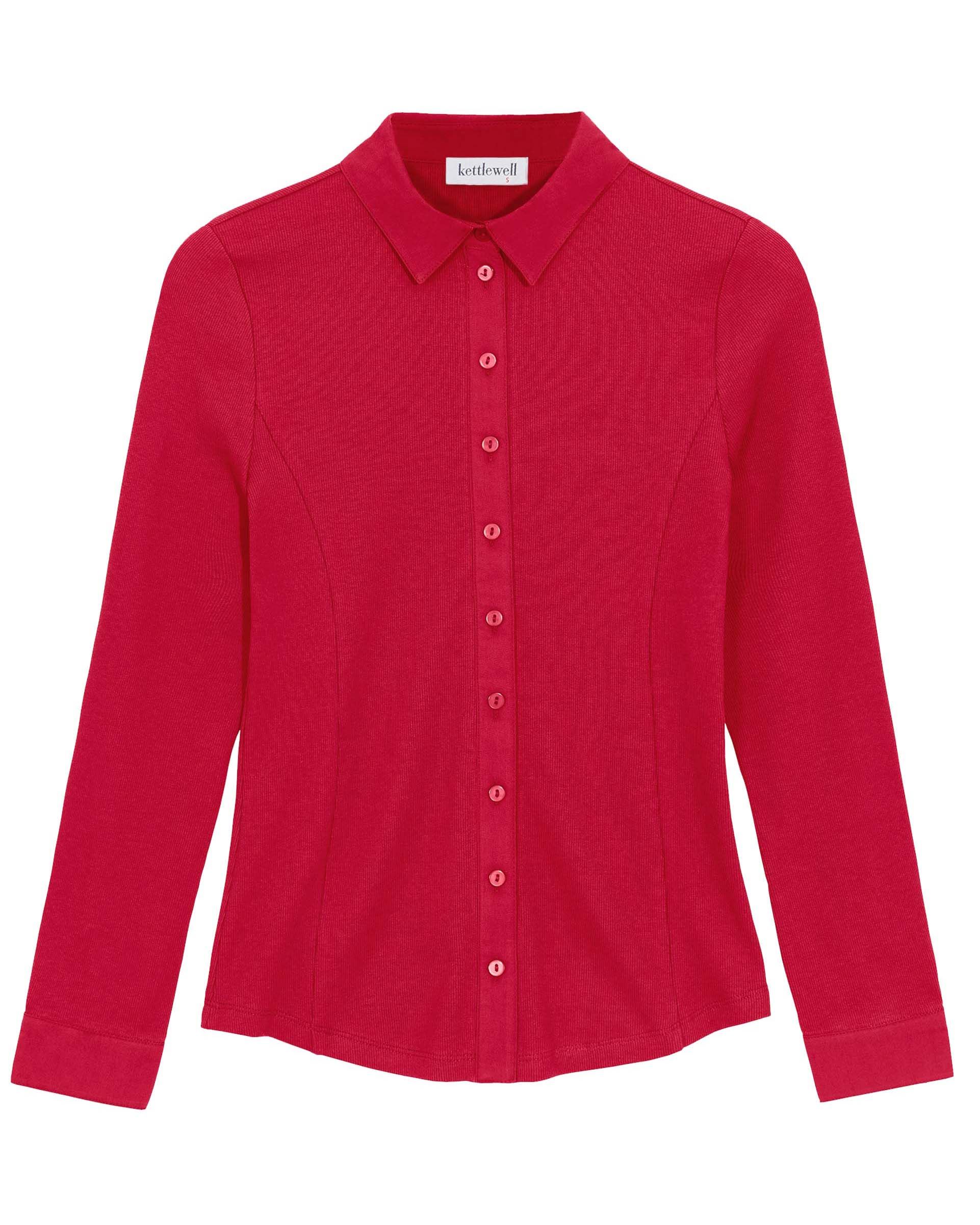 This soft cotton fitted ribbed shirt features a curved hemline and princess seam detail front and back for additional shaping as well as woven collar, cuffs and placket.