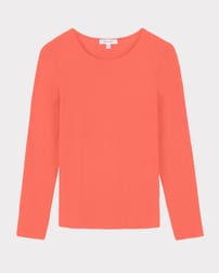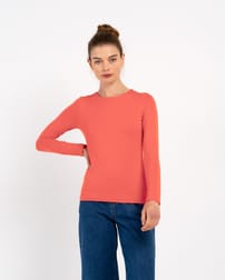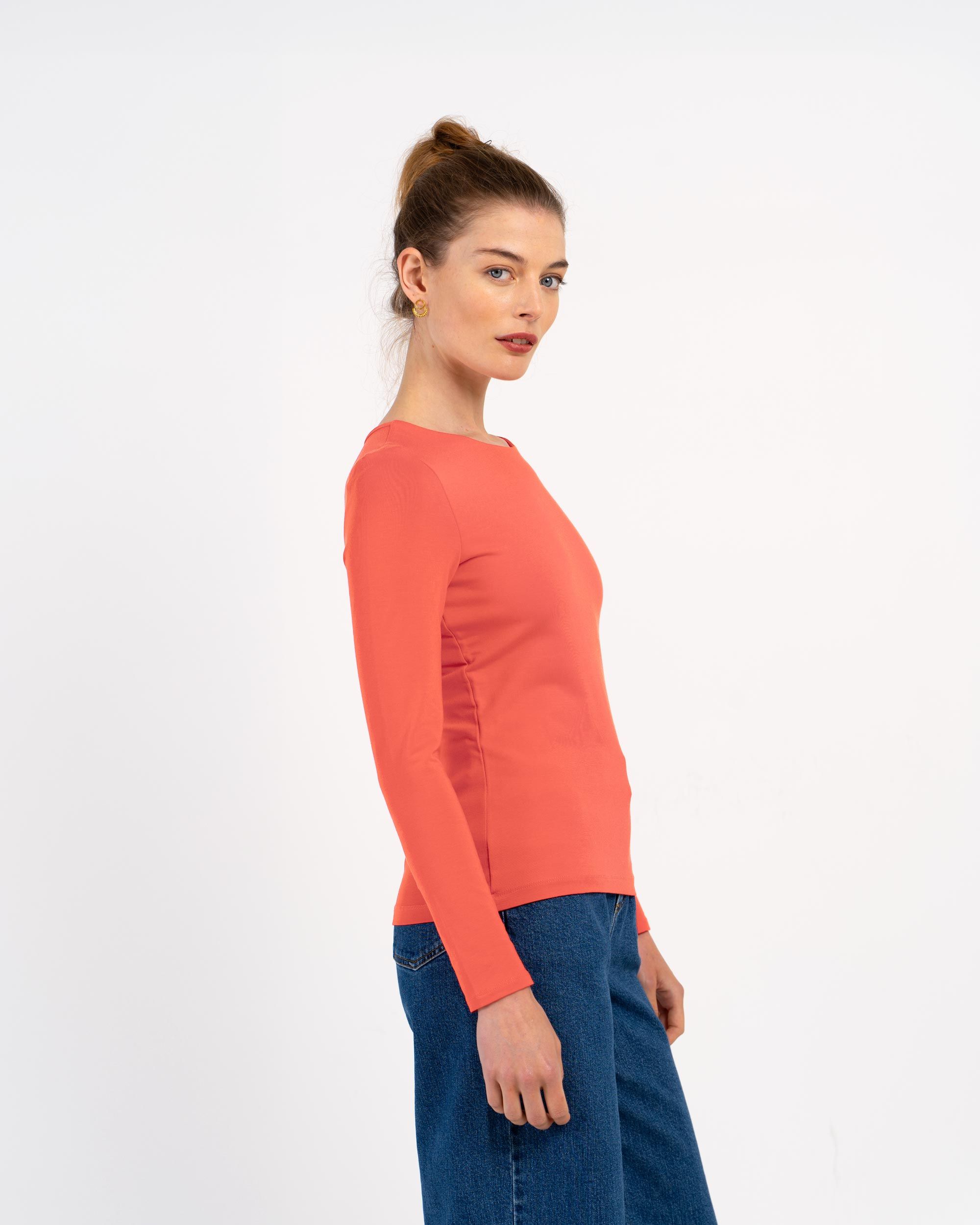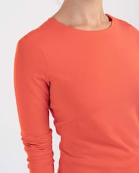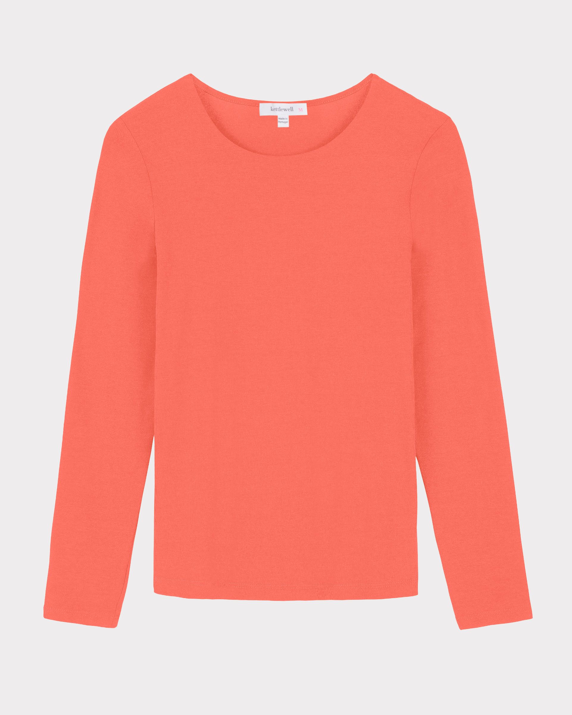 A fitted top with a classic crew-shaped neckline and long sleeves. The double-fronted, clean, stitch-free neckline creates a soft, structured, and smooth look, ensuring nothing shows through. The cotton modal blend feels wonderfully lightweight and soft, while offering excellent breathability and gentle stretch, so you stay comfortable all day. Ideal for work to weekend, this piece pairs beautifully with trousers or jeans.