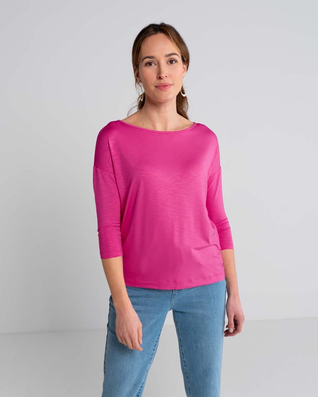 Designed with a slash neckline and long sleeves, this fitted piece brings a modern edge to your wardrobe. The double-fronted, clean, stitch-free neckline creates a soft, structured, and smooth look, ensuring nothing shows through. The cotton modal blend is lightweight and soft, offering excellent breathability and gentle stretch. Ideal for work to weekend, this piece pairs beautifully with trousers or jeans.