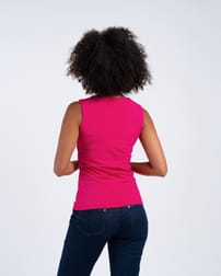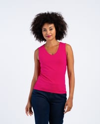 This fitted top features a V front neckline and sleeveless design. Made from a cotton modal blend, it has double front and back fabric for a smooth finish. A versatile, hard working style.