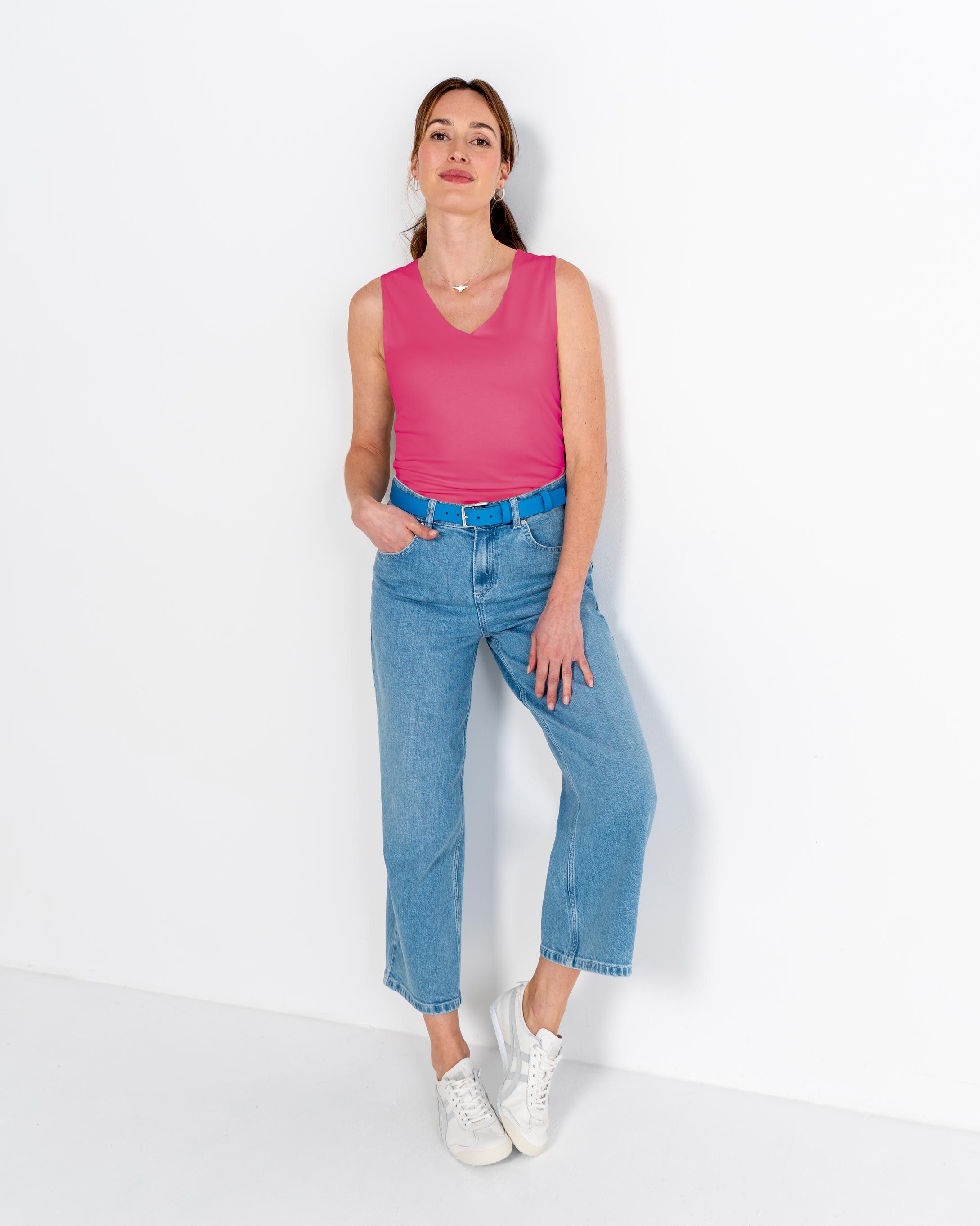 This fitted top features a V front neckline and sleeveless design. Made from a cotton modal blend, it has double front and back fabric for a smooth finish. A versatile, hard working style.
