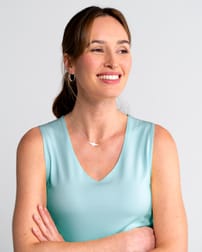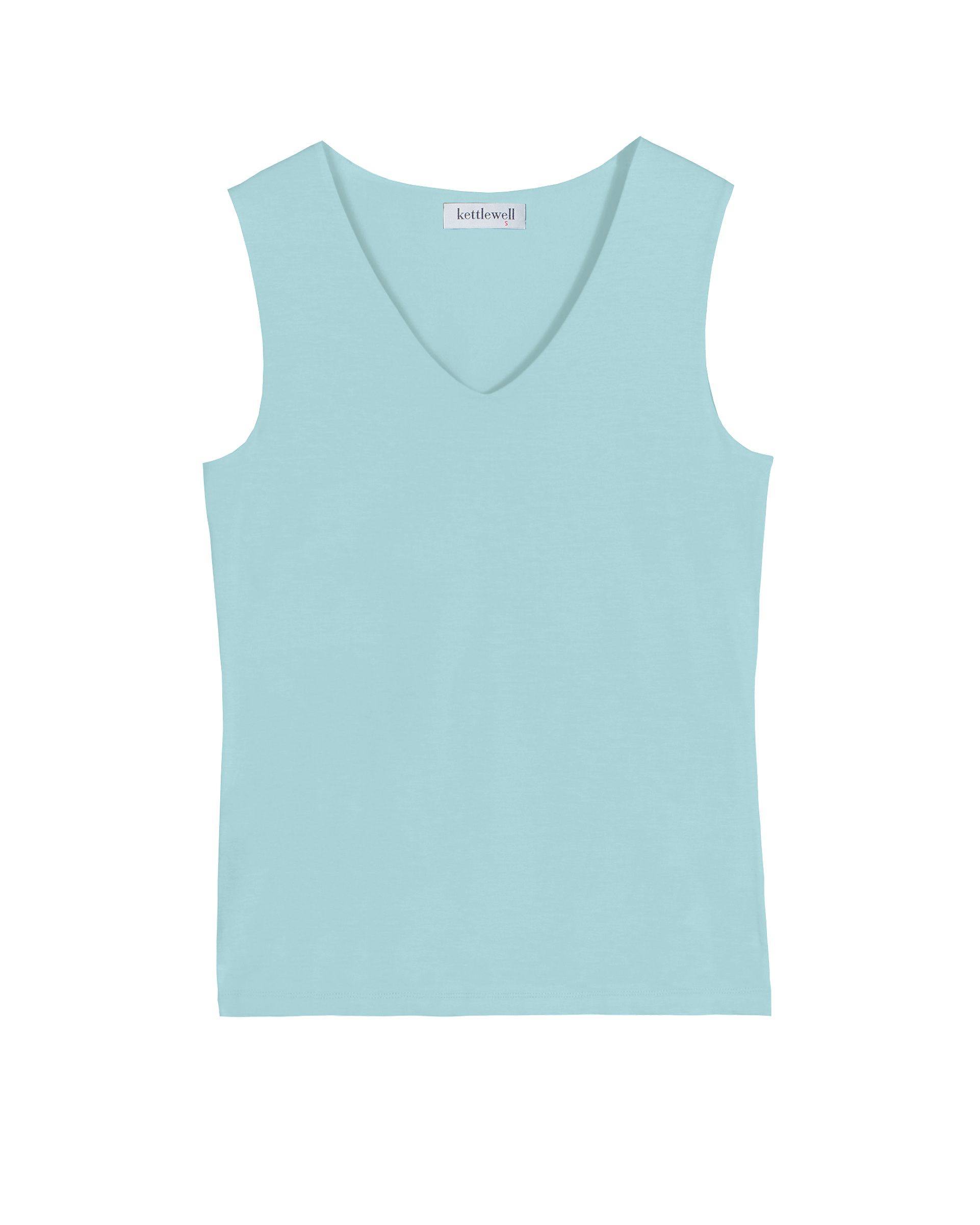 This fitted top features a V front neckline and sleeveless design. Made from a cotton modal blend, it has double front and back fabric for a smooth finish. A versatile, hard working style.