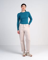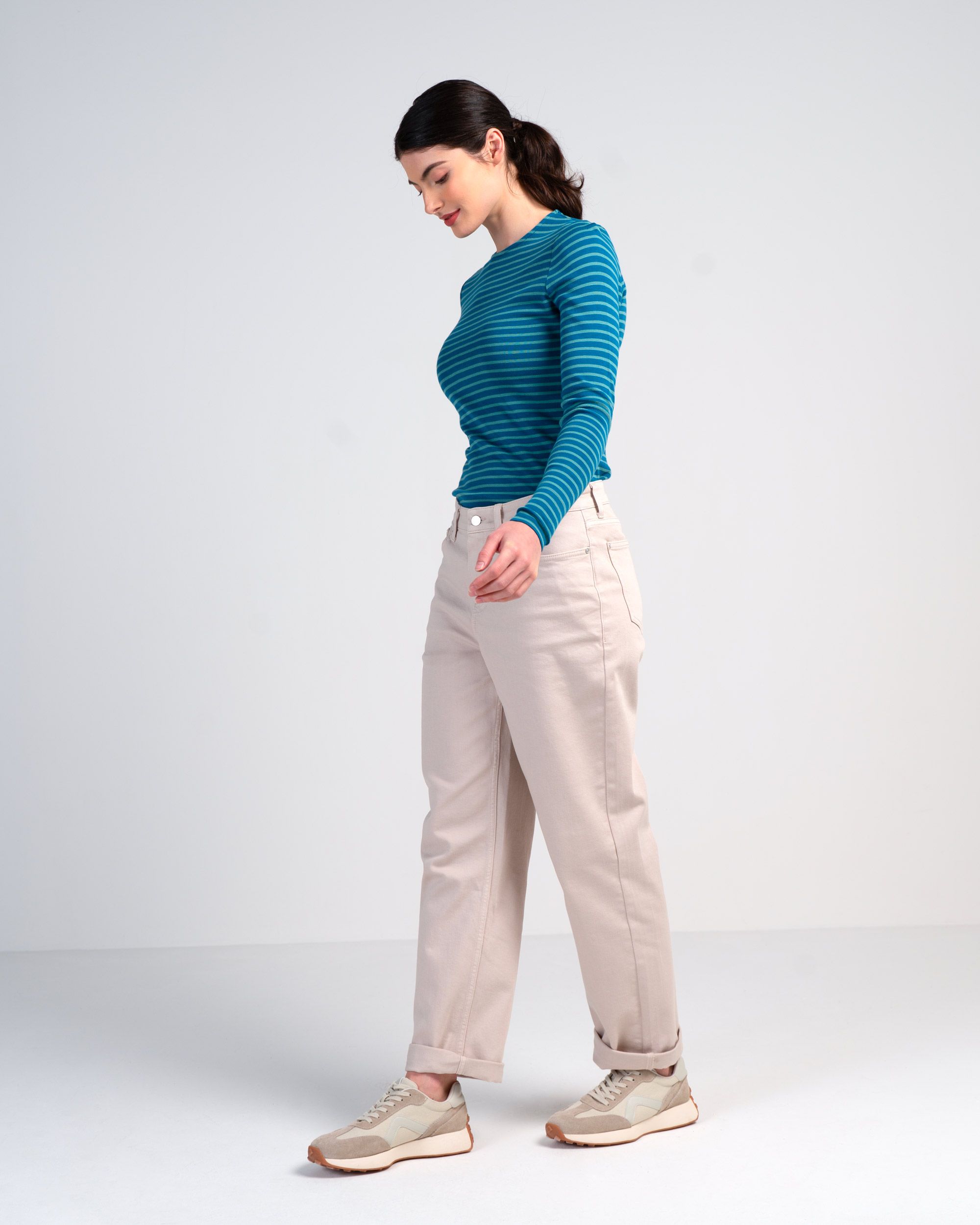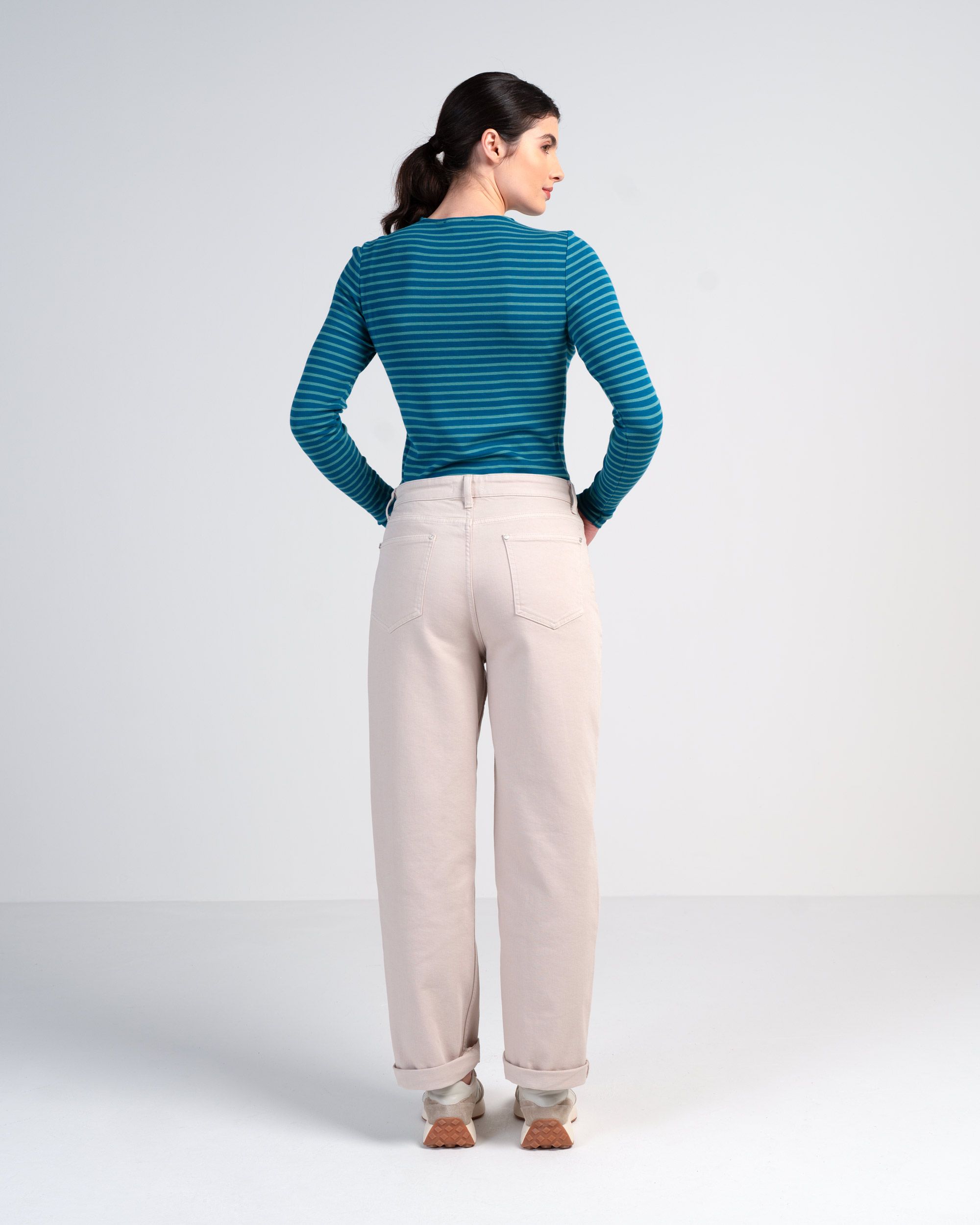 These mid rise full-length boyfriend jeans with rolled up hems are wide leg and straight fit and feature a classic 5-pocket design, front zip and fly fastening, belt loops, and subtle button and rivet details. Made from original Darla Denim fabric.