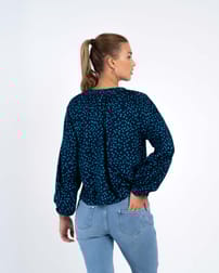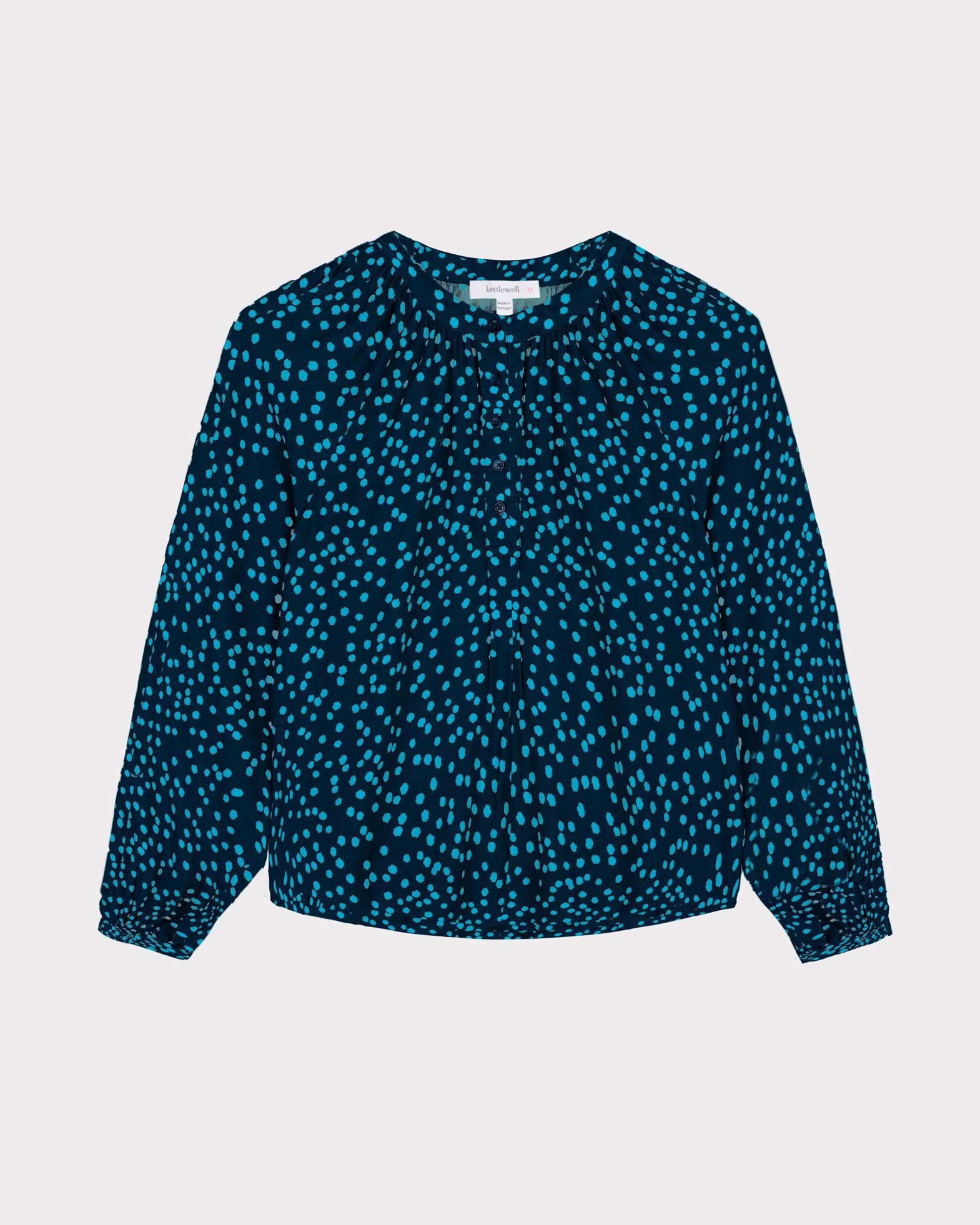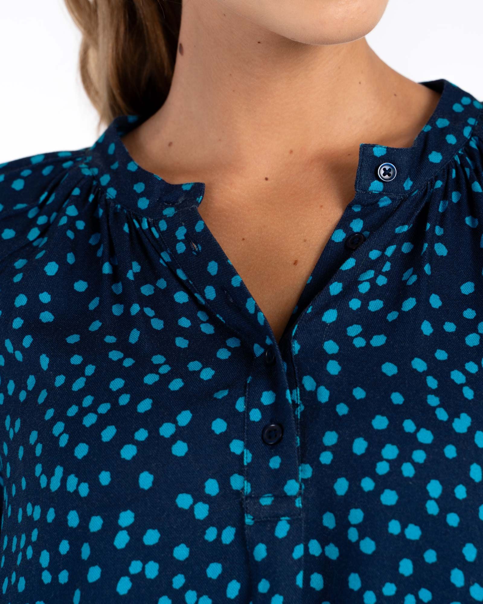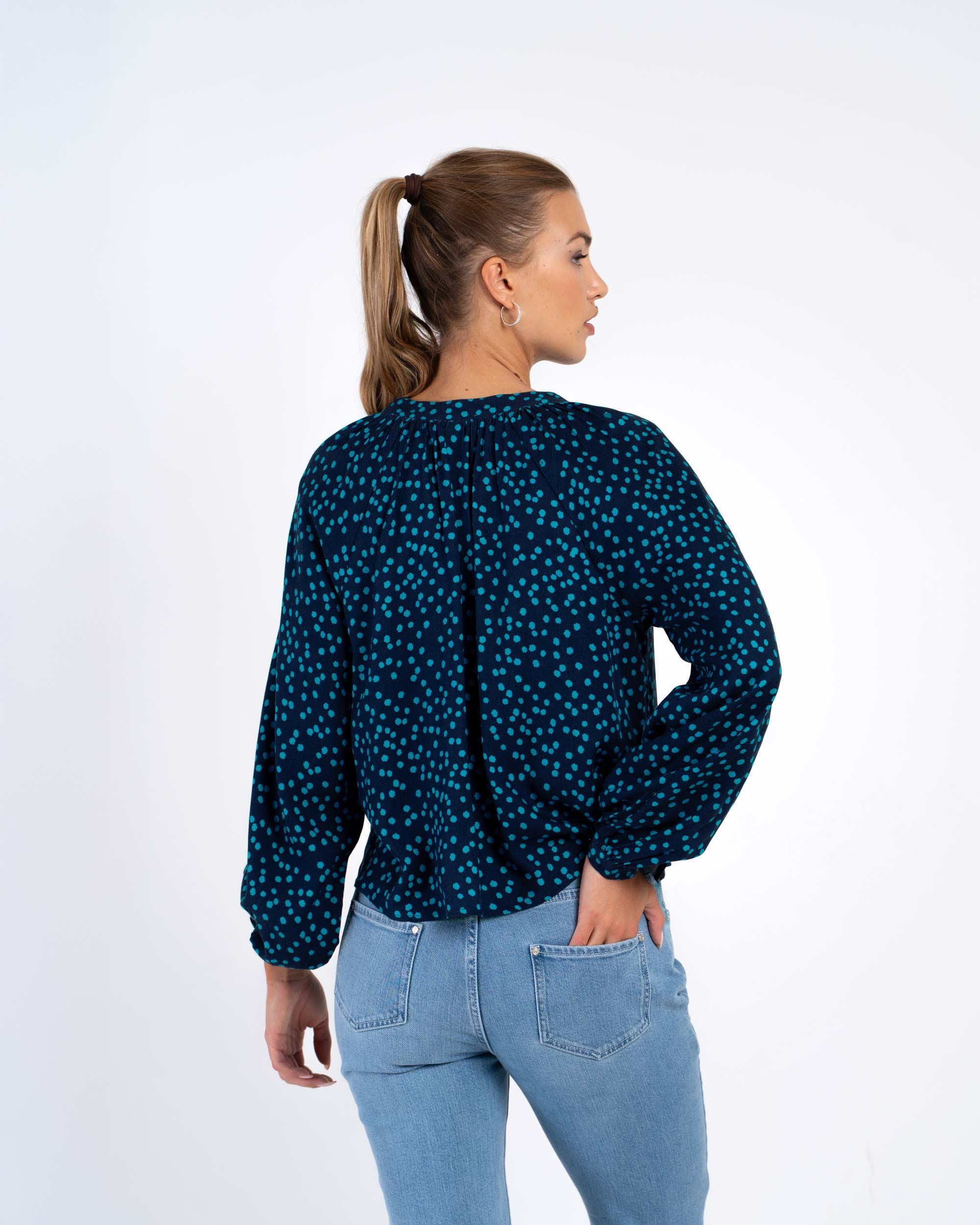 A blouse designed with both style and versatility in mind, crafted from 100% EcoVero viscose this piece is perfect for work-to-weekend wear and an essential addition to any capsule wardrobe. The round neckline is finished with a short button placket and gentle gathers for soft detail, while long raglan sleeves with buttoned cuffs create a relaxed yet refined silhouette. Hem shaping, with small side slits and a subtle pleat at the end of the placket, adds movement and a flattering finish.