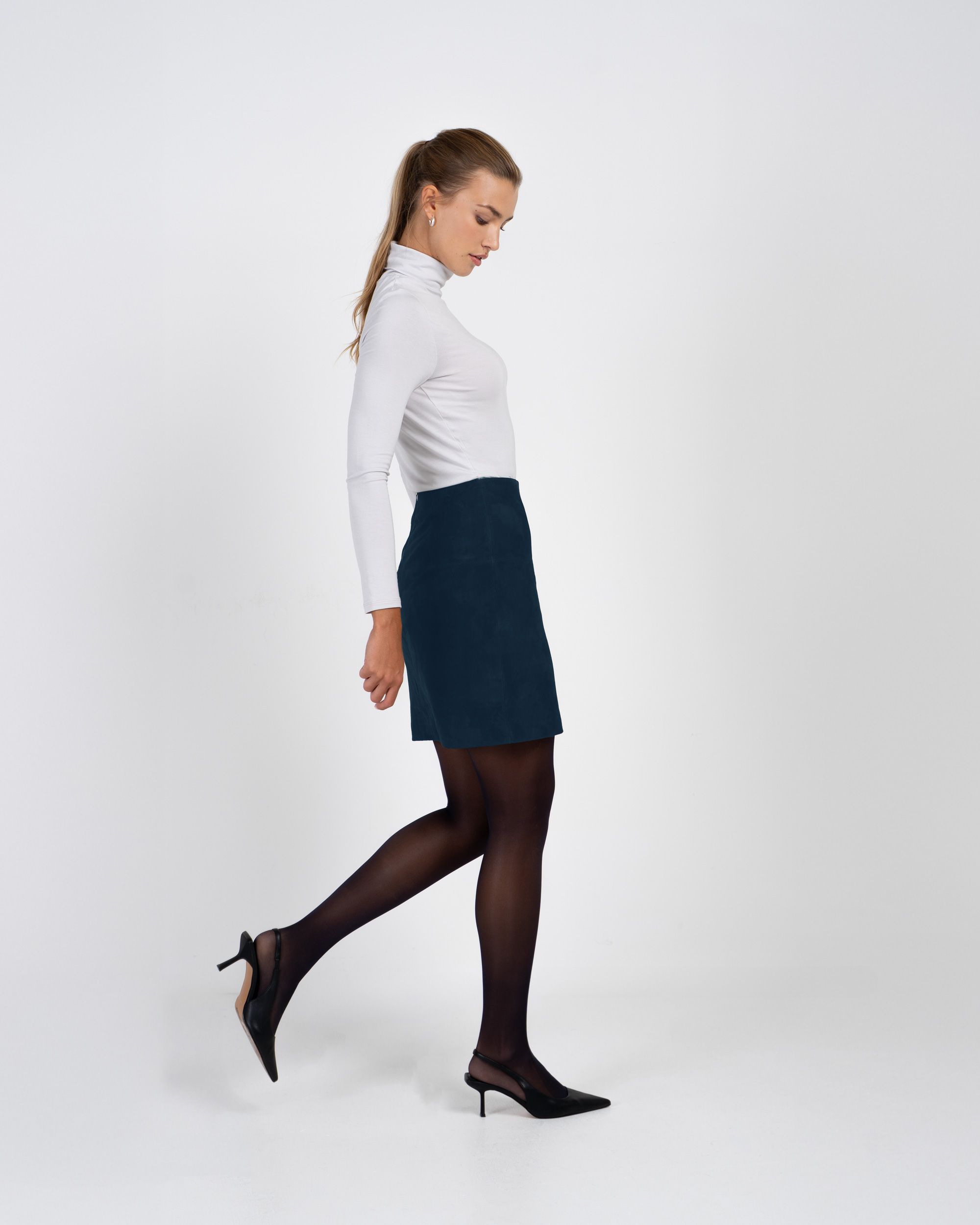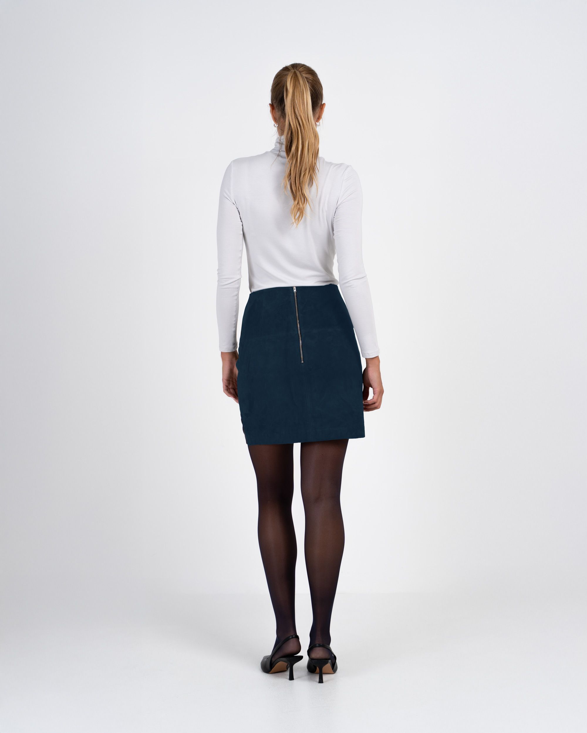 A chic wardrobe staple that blends timeless texture with modern style, this short suede skirt offers endless versatility for both workdays and weekends. Designed in a flattering straight shape with front and back panel detailing, it features a neat flat front, central back zip and full lining for a smooth, comfortable fit. Crafted from 100% leather suede, the fabric has a beautifully soft, velvety finish that gives natural structure while remaining supple to wear. This item pairs effortlessly with the Silky Collection or the Harper Jacket for a refined, coordinated look.