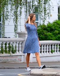 This knee-length dress features a graceful boat neckline, 3/4 length sleeves, and a fitted top half that flares into a beautifully full skirt, thanks to clever godet panels that enhance movement and shape. Made from a soft, substantial viscose elastane jersey, it offers gentle stretch, a smooth drape, and all-day comfort while retaining its shape after every wash, so you can wear it as a single layer. The easy two-colourway print makes it a capsule wardrobe standout, ideal for parties or everyday wear. Pairs perfectly with your favourite jackets, scarves, and accessories.