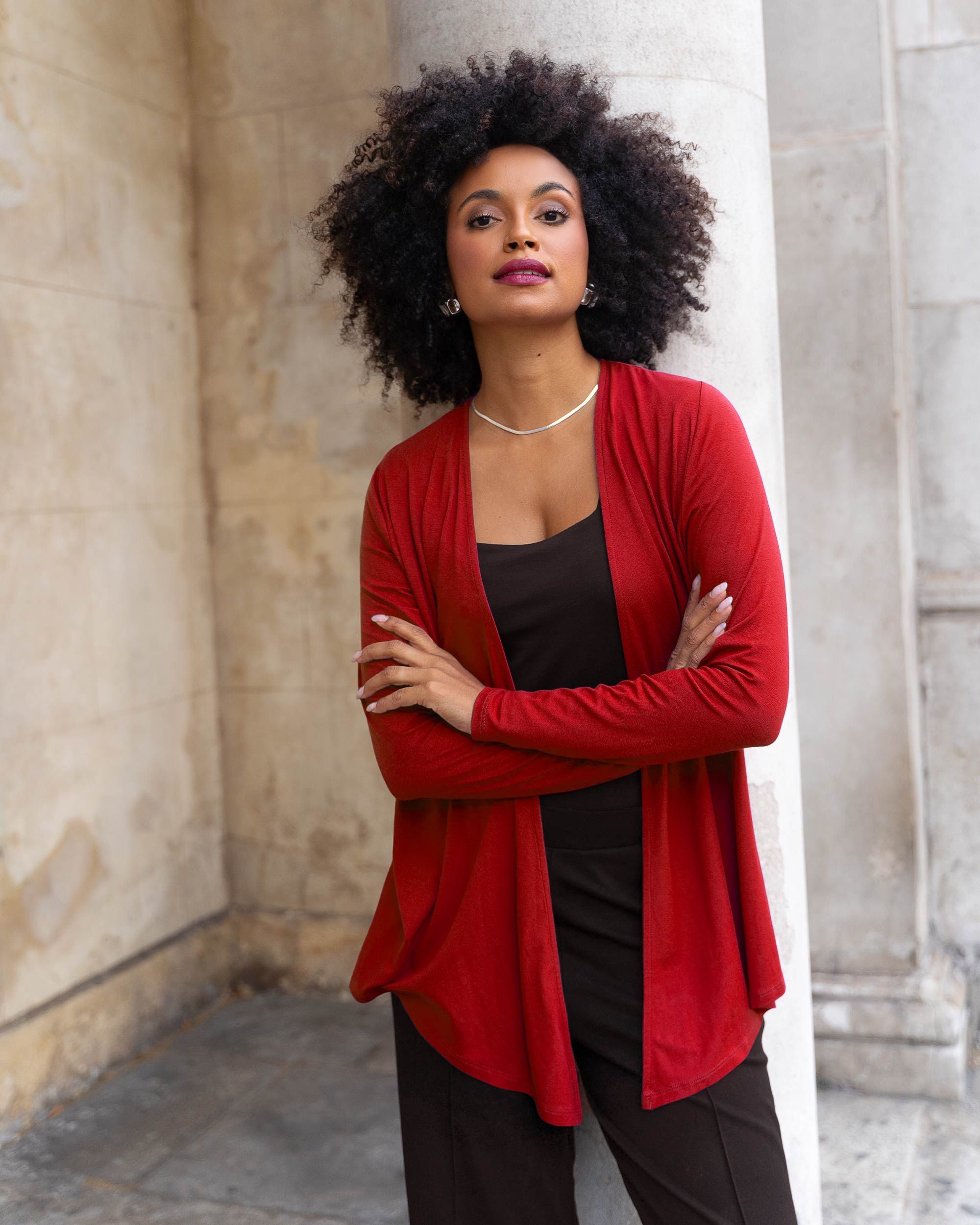 A soft jersey wrap that adds effortless style and comfort to your everyday layering. Designed with an easy edge-to-edge front, this mid length piece drapes beautifully for a relaxed yet polished finish. The long sleeves and regular fit make it perfect for weekends, everyday wear or transitional weather, offering lightweight warmth without bulk. Crafted from viscose jersey with natural stretch, the fabric feels smooth, breathable and flexible, ensuring comfort that moves with you. The colours coordinate perfectly with the Betty Cowl range, allowing you to create a seamless column of colour when worn together.