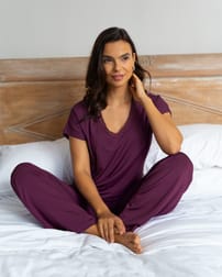 Drift into comfort and style with this pyjama top, with its elegant deep V neckline edged in delicate lace, dyed to match the fabric for a seamless finish, and its short, grown-on dolman style sleeves, this top feels both effortlessly elegant and wonderfully relaxed. The straight, loose body shape gives a generous fit, making it perfect for lounging, sleeping, or cosy movie nights at home.
