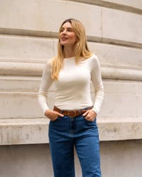 With its high crew neckline, longer-length body and fitted cut, this top can be worn on its own as well as a layering piece. The long sleeves and longer length add extra coverage, making it ideal for year-round wear.