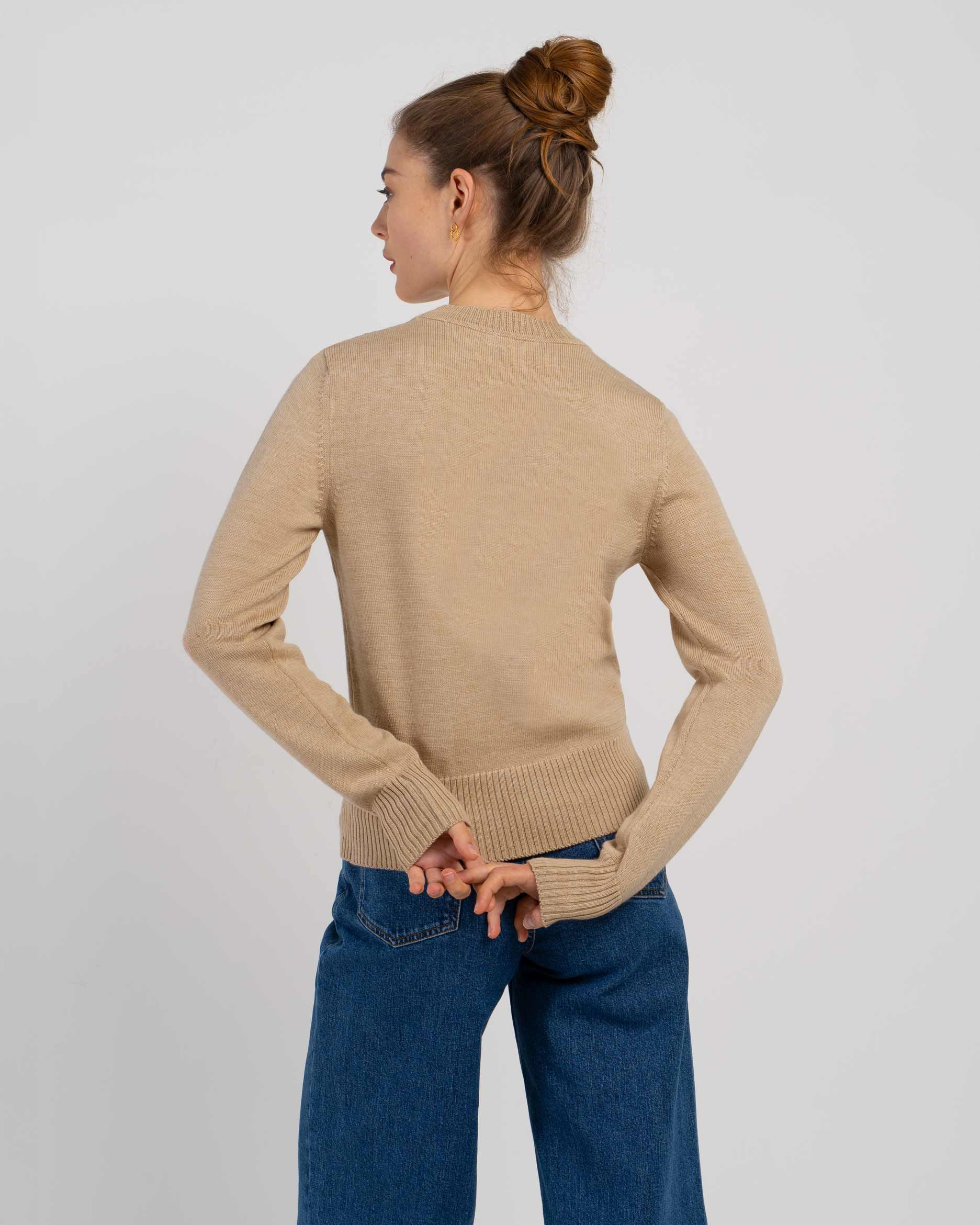 100% Merino wool, a natural fibre prized for its softness, warmth and lightness. Unlike traditional wool, it feels smooth and fine against the skin, never itchy. Merino helps regulate body temperature, keeping you warm when it’s chilly but cool when the day warms up. Strong, breathable and enduring, it makes for timeless, long-lasting knitwear.