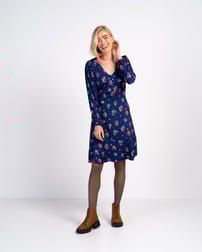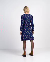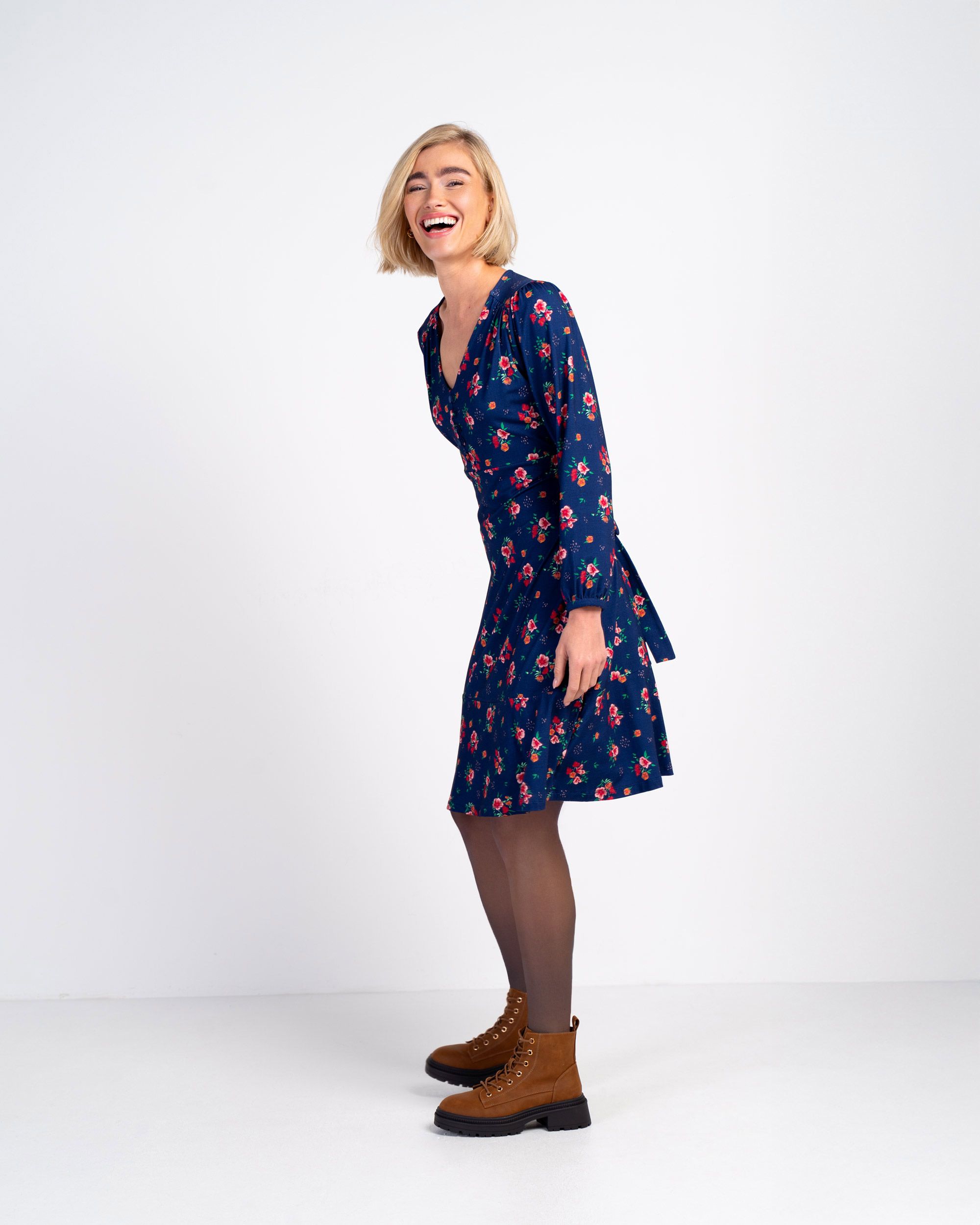This printed jersey dress combines soft drape with thoughtful detailing for an effortlessly flattering fit. Designed with a V-shaped neckline, waist ties and covered buttons to the waist, it shapes the silhouette beautifully while offering versatility. Gentle gathers at the shoulders and cuffs add a touch of elegance, while the flared skirt with a frill hem brings graceful movement with every step. The open, spaced floral print comes in four distinctive colourways, each reflecting the season’s palette, while the same shape is also available in a leopard print design for a bolder take.