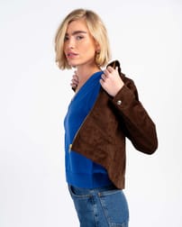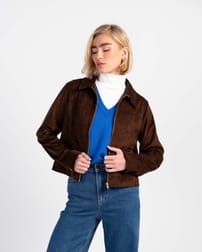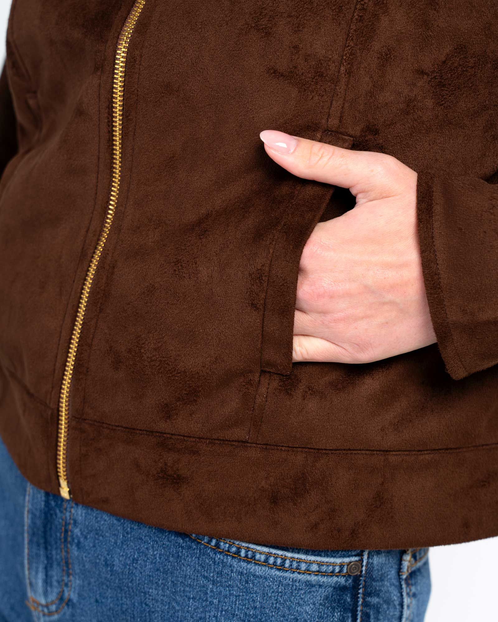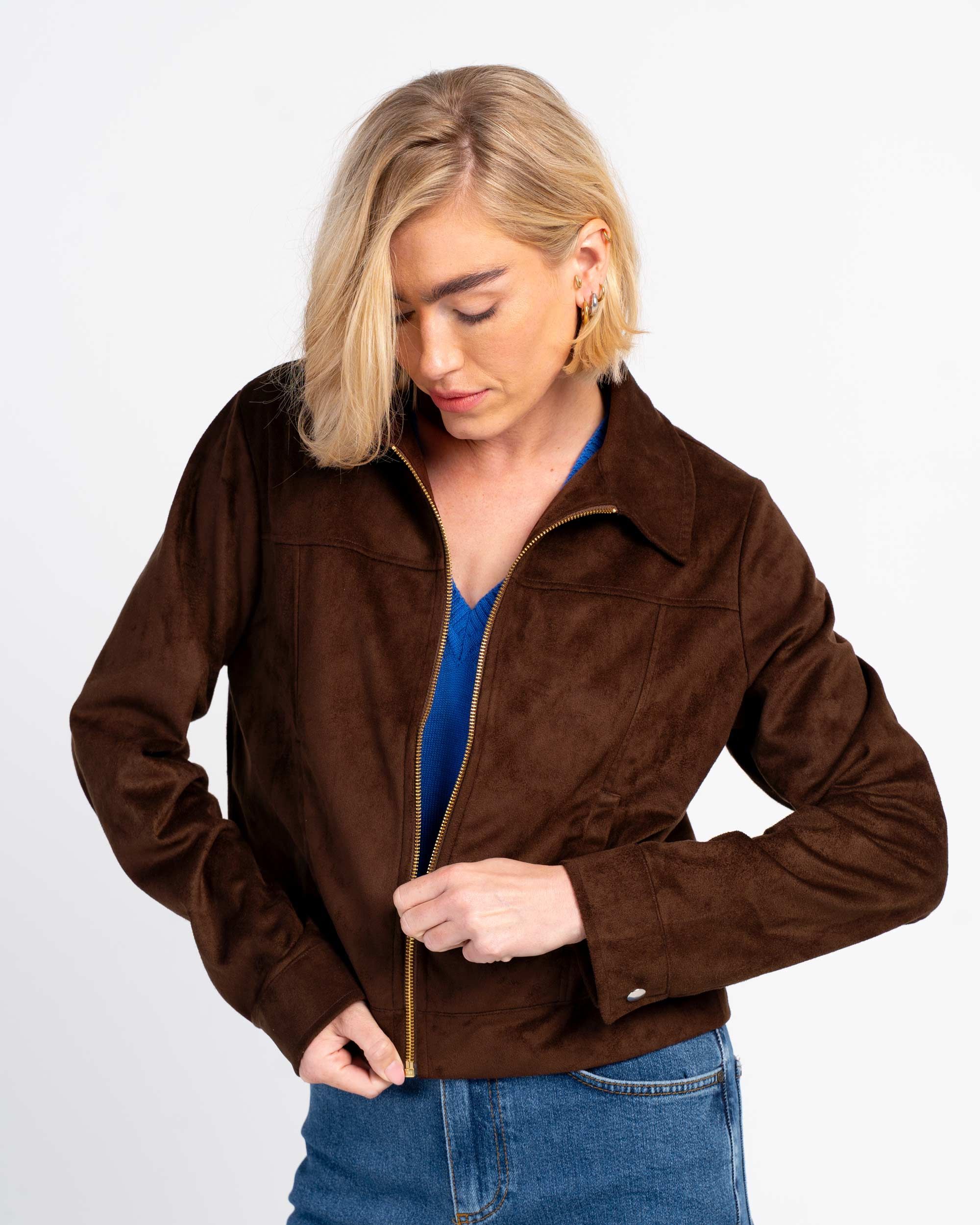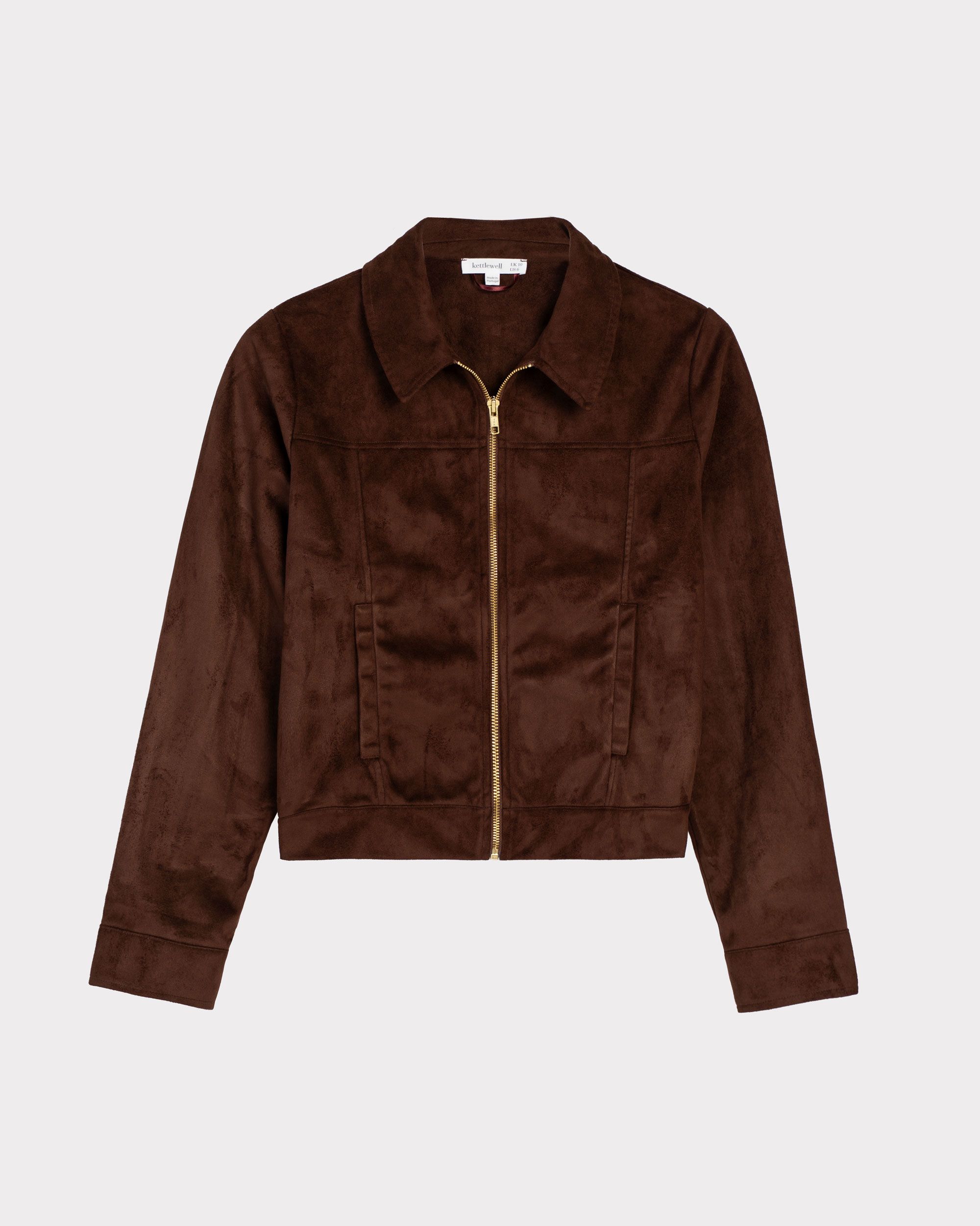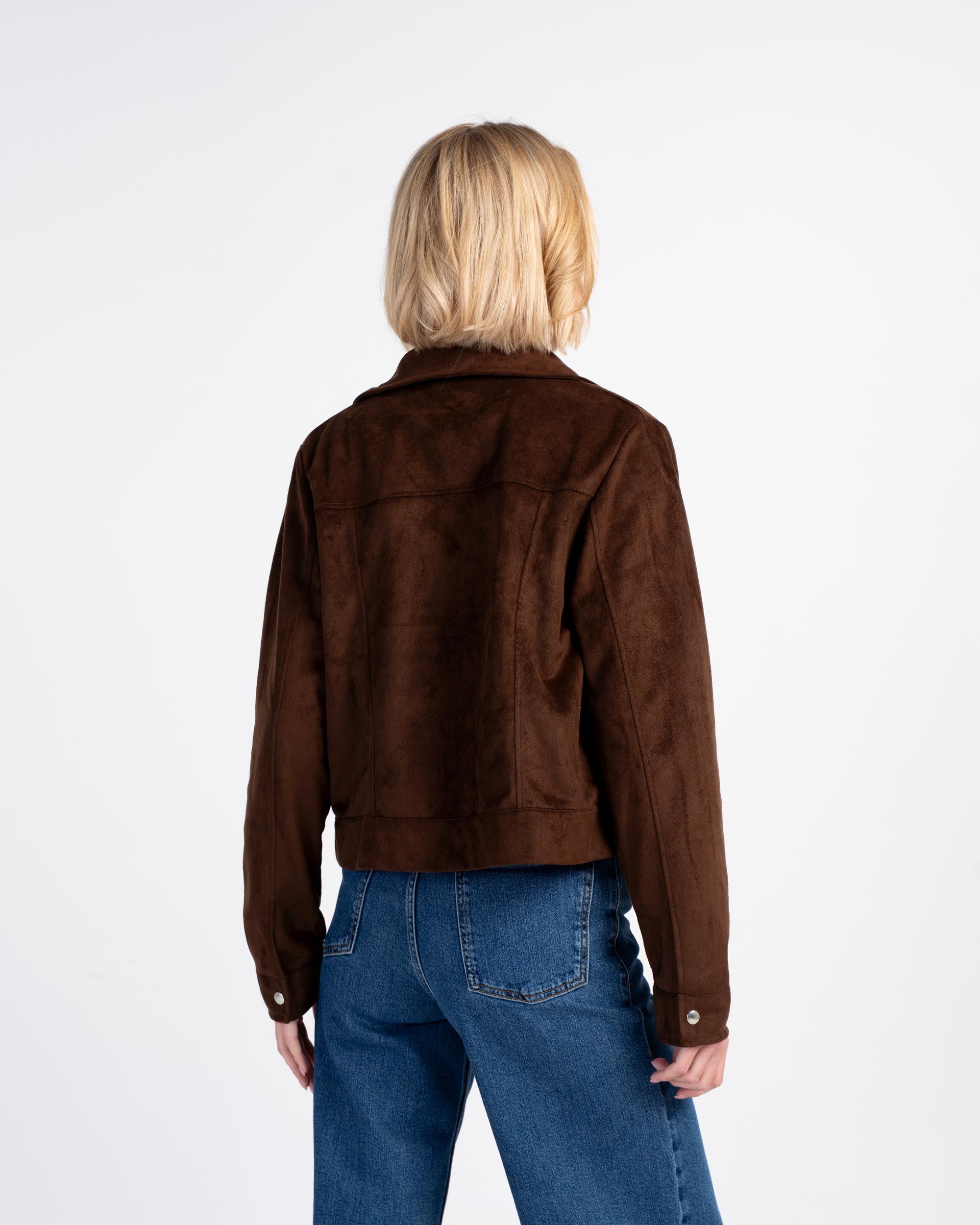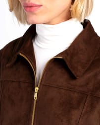 A softly structured jacket with a collared neckline, front pockets, full zip front and front-and-back seaming create a flattering fit, while the long sleeves and popper‑detail cuffs add a practical yet polished finish. Made from soft faux suede, it has a smooth, velvety touch.
