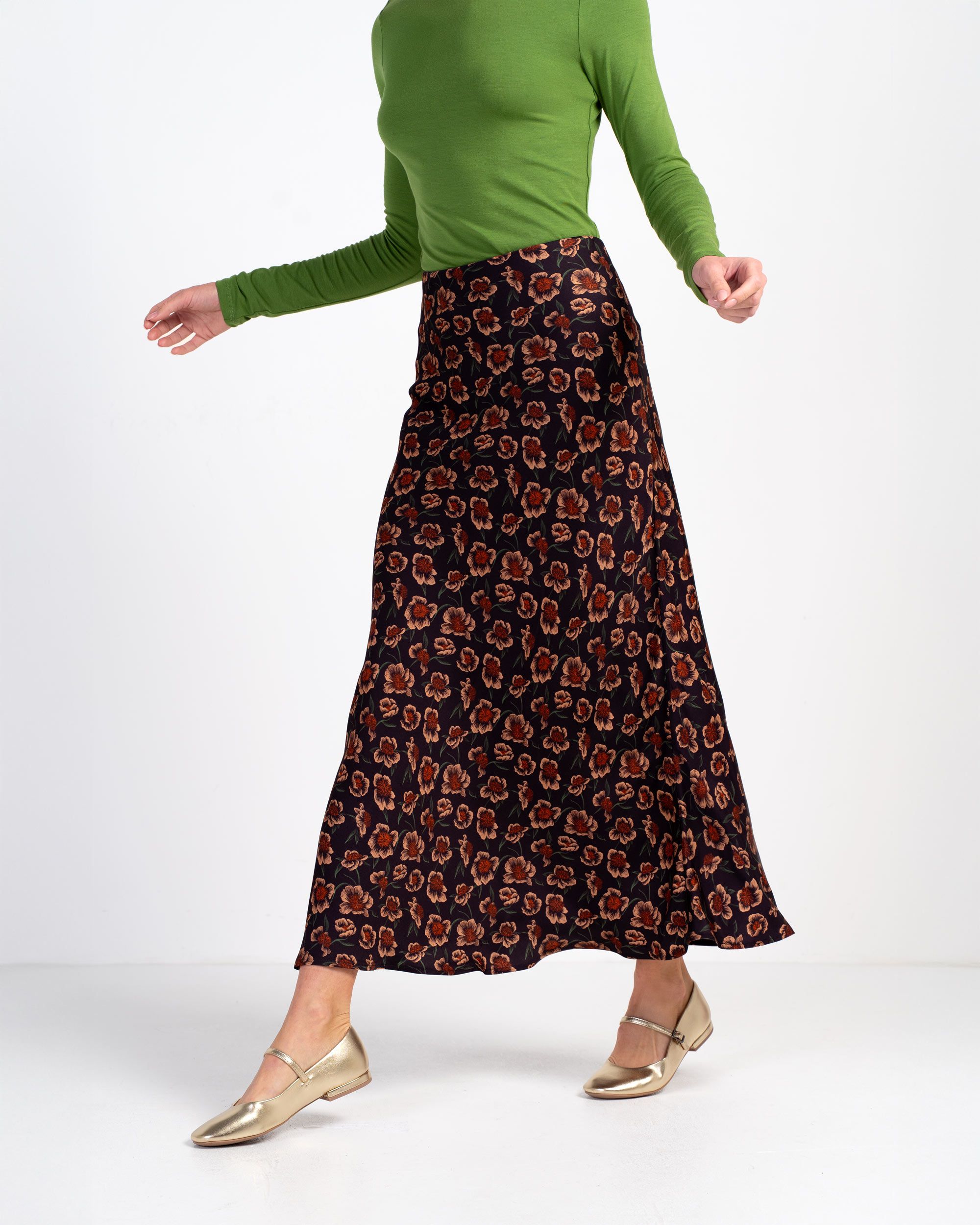 - Bias-cut skirt with smooth, flattering drape