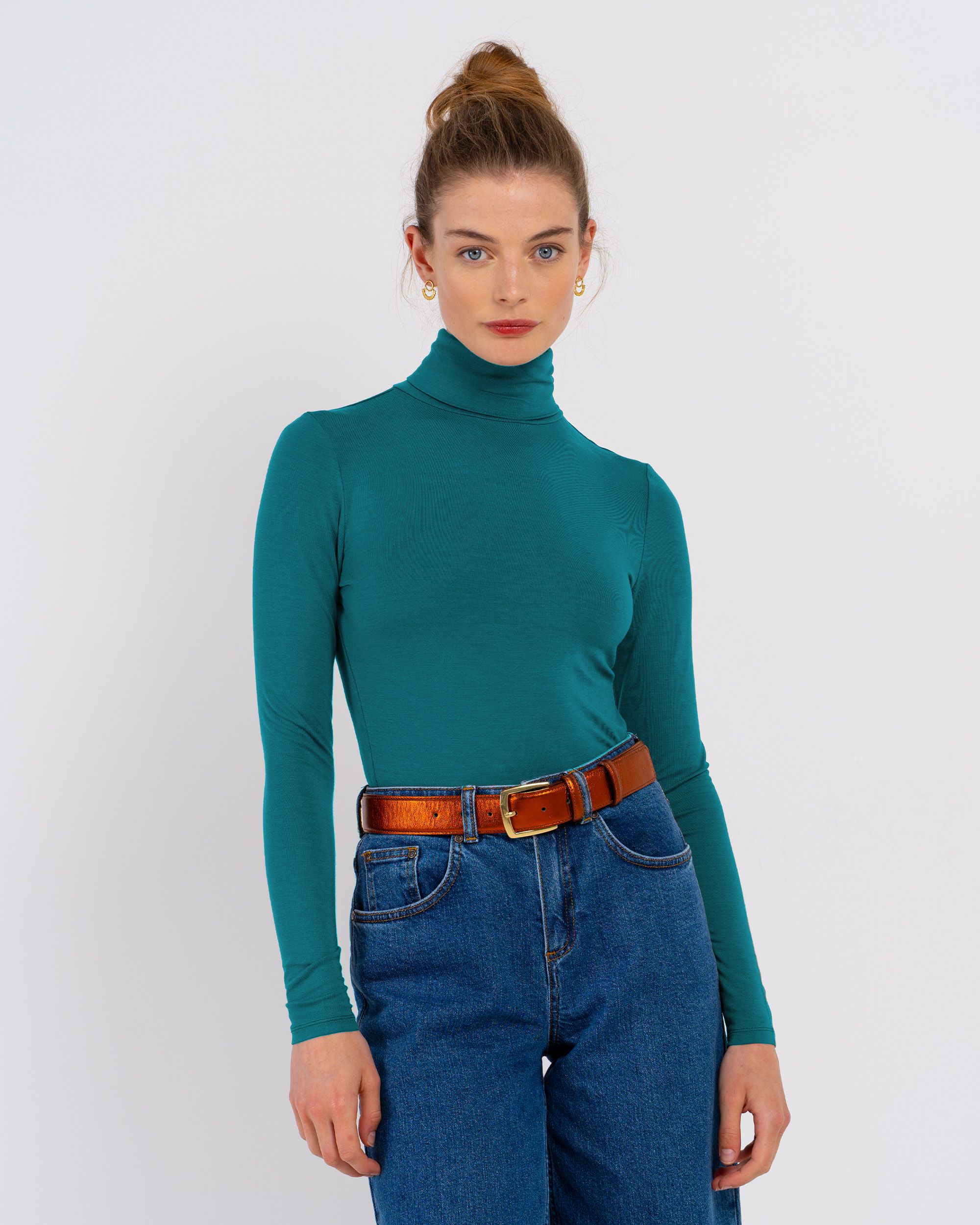 This fitted roll neck top, crafted from a smooth and lightweight modal-elastane blend, features long sleeves and a longer length. Our best-selling product year after year.
