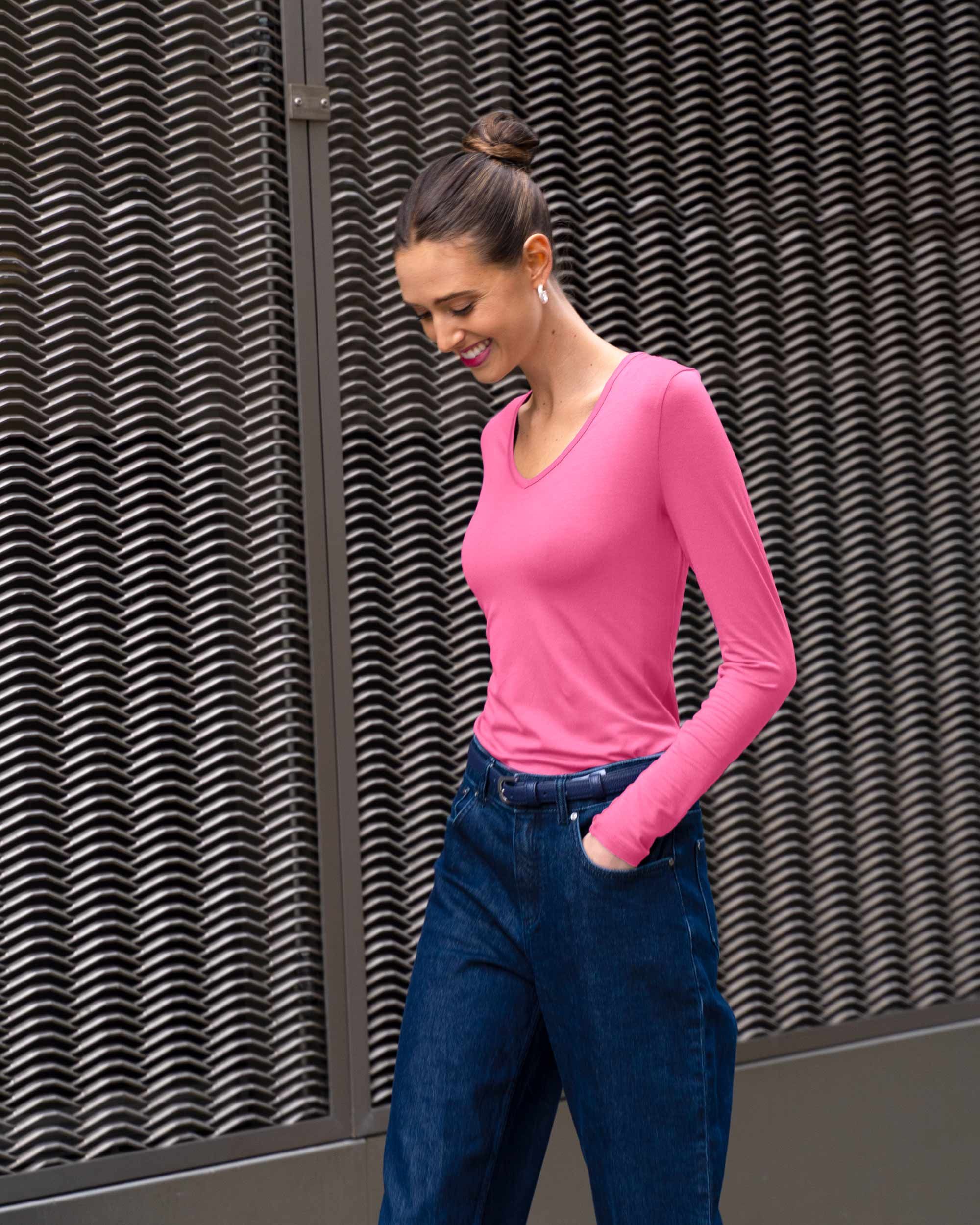Featuring a flattering V-shaped neckline, long sleeves, and longer length body, this is great for layering as well as on its own. Crafted from our signature silky modal-elastane blend, this fitted design sits neatly against your curves. Pair it with jeans, skirts or trousers for easy versatility. Part of the Silky Collection, this top is set to be on regular rotation in your wardrobe.
