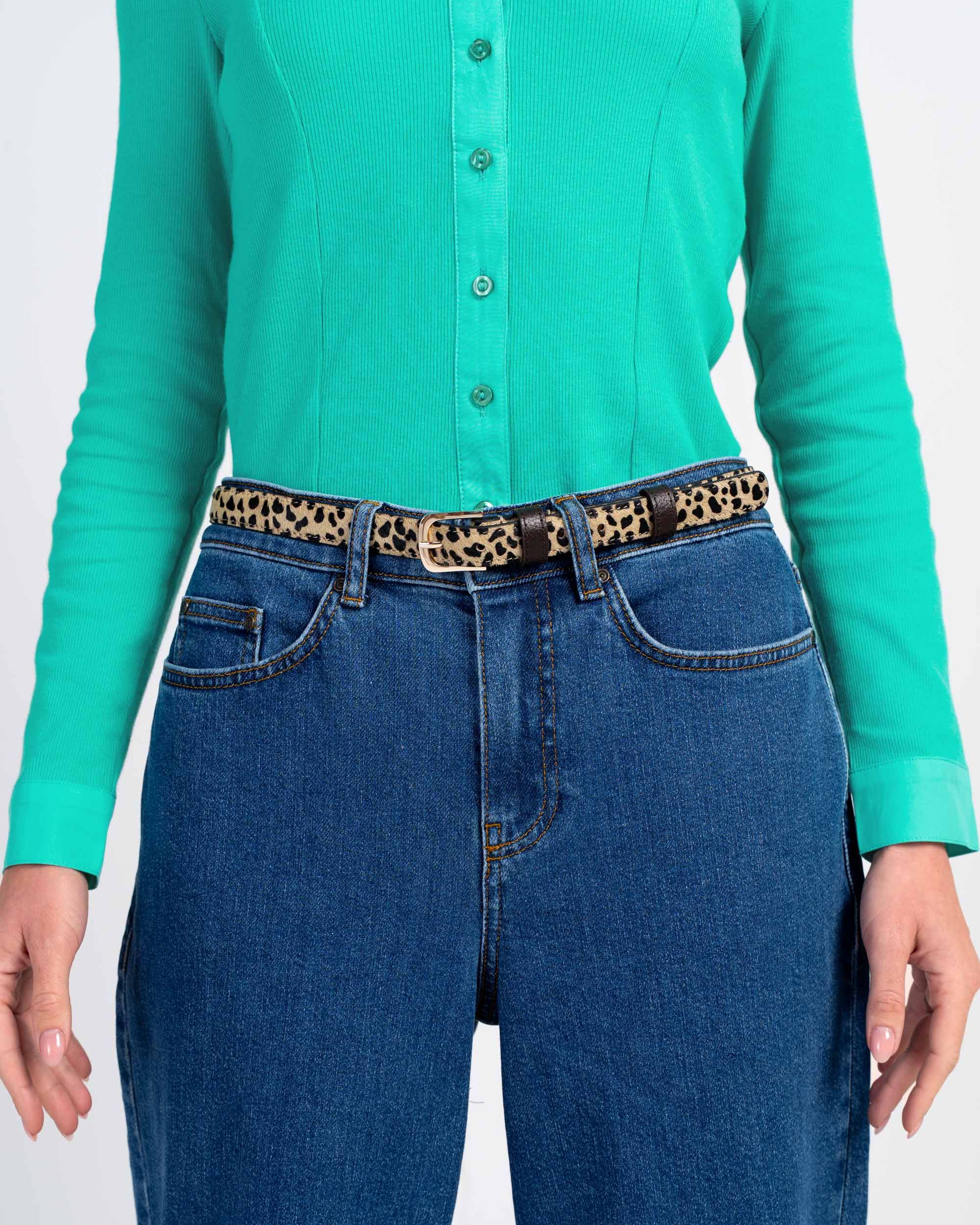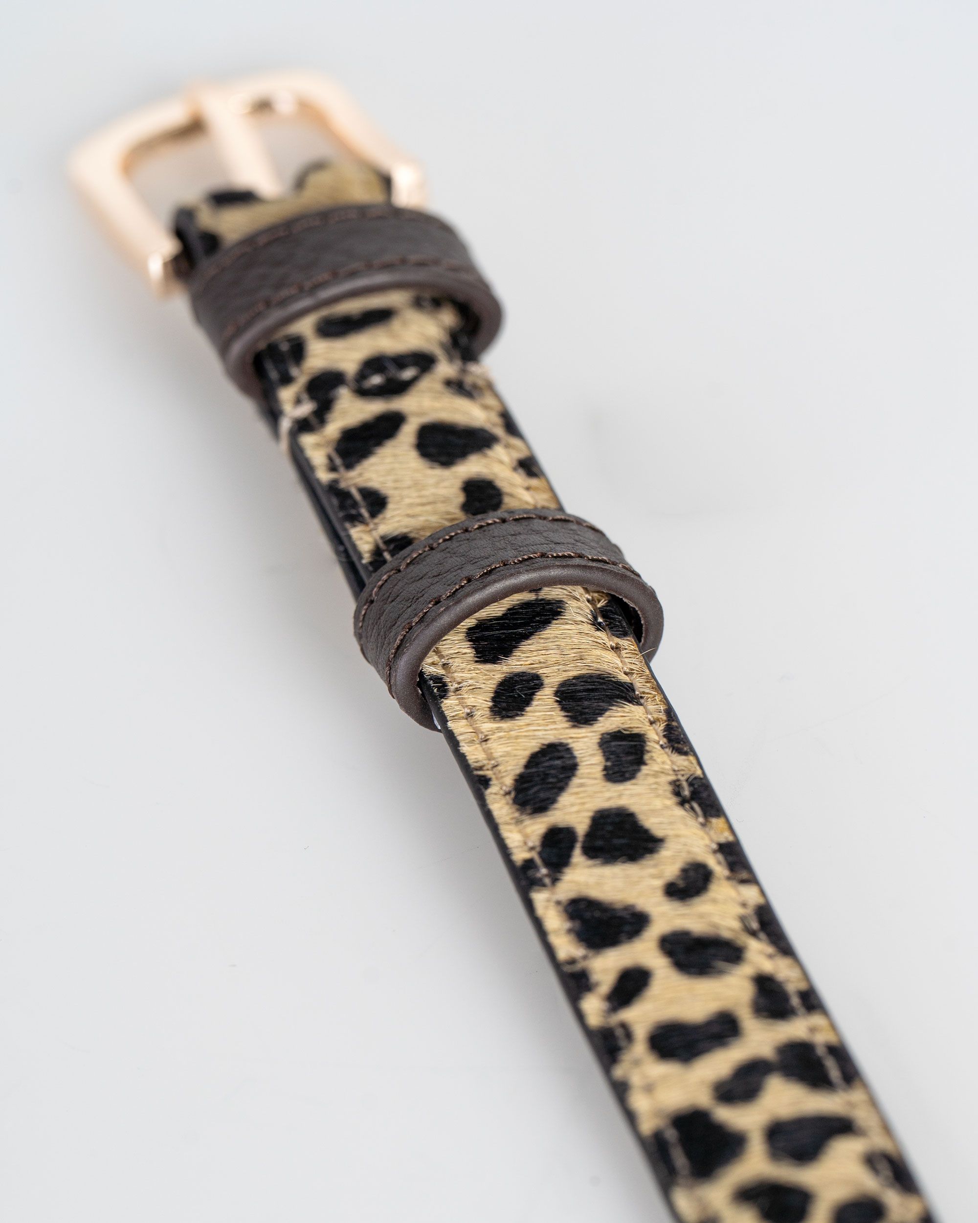 This skinny leather belt features an animal print design and rectangular buckle with seven holes for an adjustable fit. Crafted from 100% leather.