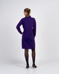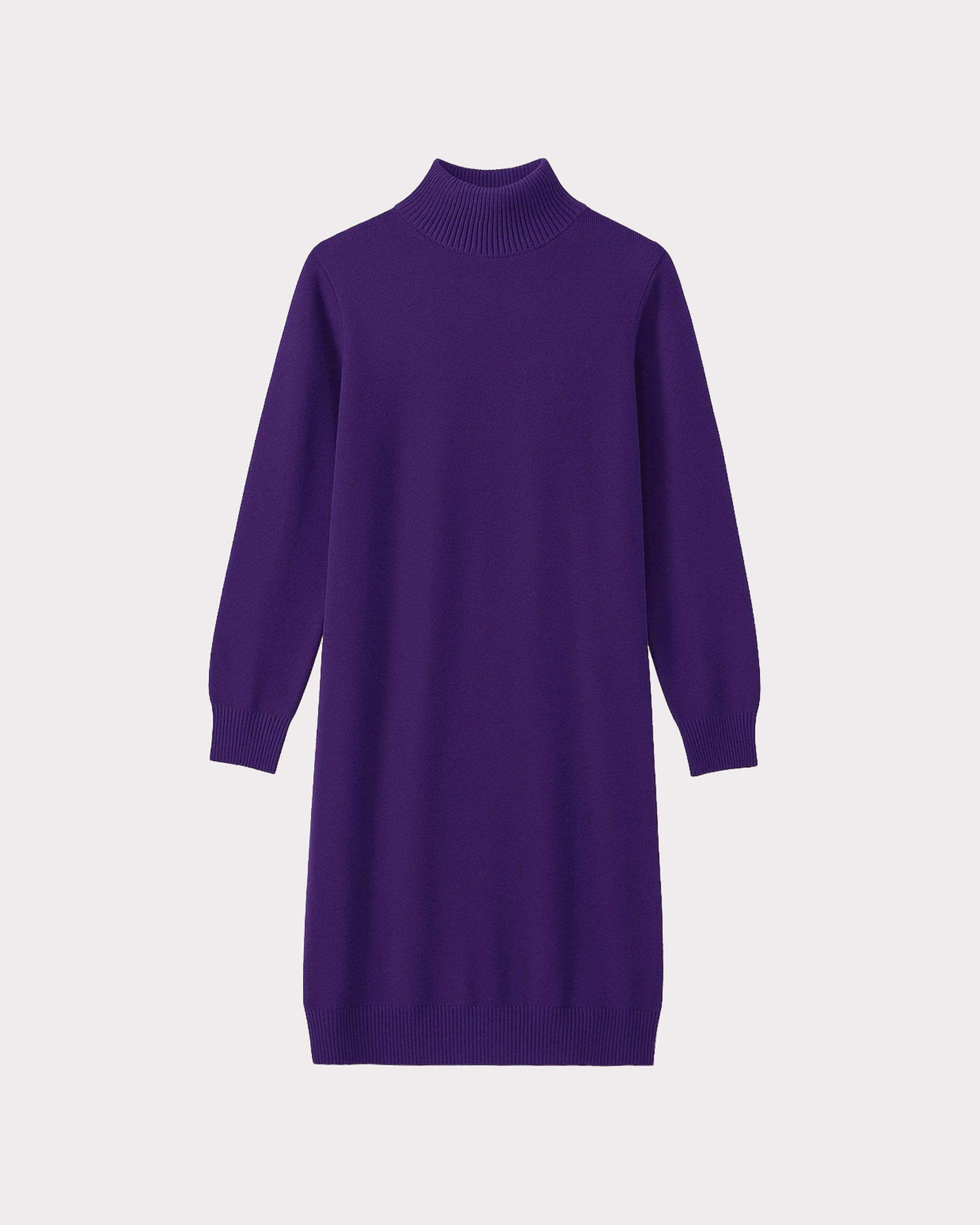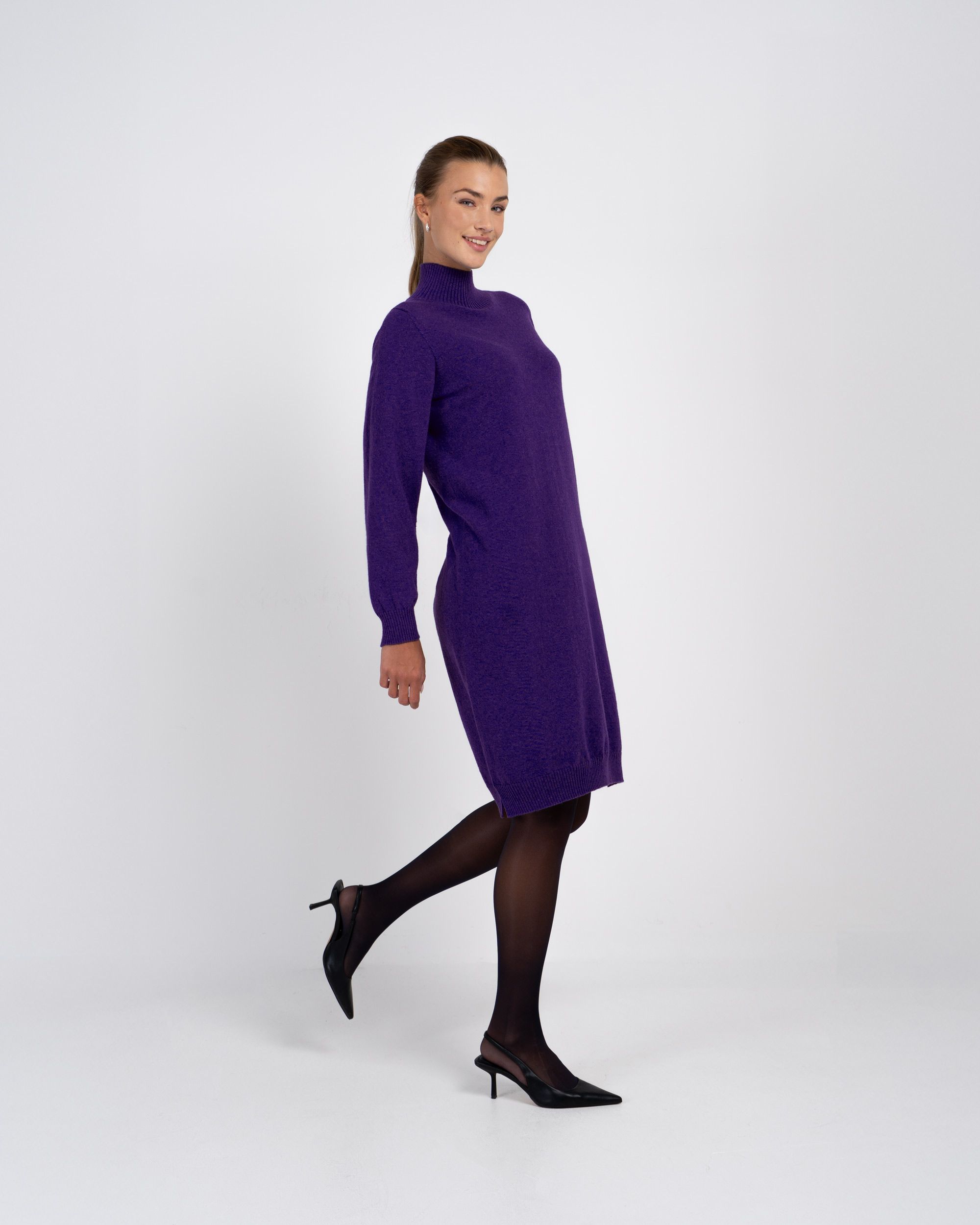 This mid length knitted dress is crafted from merino wool and has a softly structured roll neck and long sleeves. This piece offers a cosy, elegant silhouette that’s perfect for layering or wearing on its own. The straight shape and short side splits at the hem provide movement and comfort, while ribbed detailing at the neck, cuffs and hem adds subtle texture and polish.