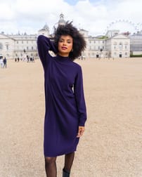 This mid length knitted dress is crafted from merino wool and has a softly structured roll neck and long sleeves. This piece offers a cosy, elegant silhouette that’s perfect for layering or wearing on its own. The straight shape and short side splits at the hem provide movement and comfort, while ribbed detailing at the neck, cuffs and hem adds subtle texture and polish.